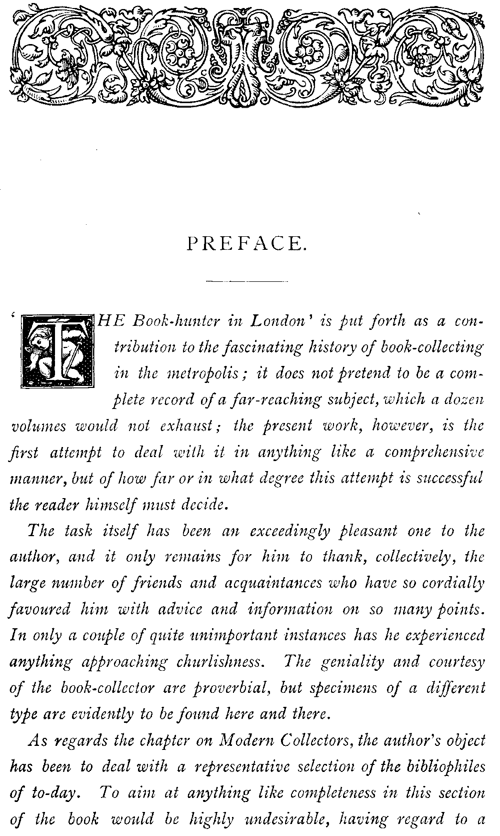 'THE Book-hunter in London' is put forth as a contribution to the fascinating history of book-collecting in the metropolis; it does not pretend to be a complete record of a far-reaching subject, which a dozen volumes would not exhaust; the present work, however, is the first attempt to deal with it in anything like a comprehensive manner, but of how far or in what degree this attempt is successful the reader himself must decide.