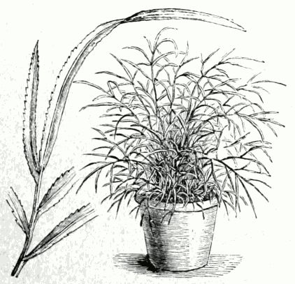 Unter den Fiederpalmen nahmen früher die Verwandten der Dattelpalme, die Phönix-Arten den ersten Platz ein. Sie sind sehr zierlich, sehr dankbar, verlangen meist eine schwere Erde. Um sie in großer Vollkommenheit zu haben, ist es nötig, sie während des Winters kühl zu halten. In neuerer Zeit werden sie von anderen Fiederpalmen, welche meist unter dem Namen Kentia oder [pg 43] Areca gehen, verdrängt.