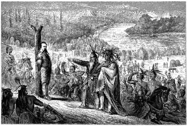 Au milieu de la prairie s'élevait une espèce de monticule de gazon, surmonté par le tronc d'un jeune chêne fourchu; c'était le poteau de la guerre; j'y fus immédiatement attaché par les mains et les pieds.