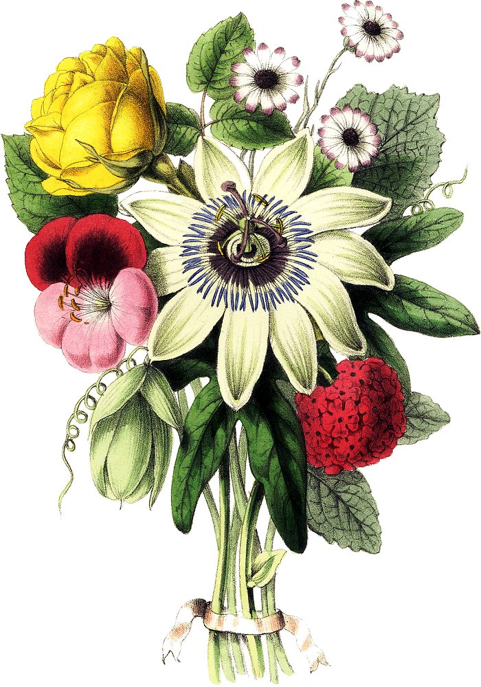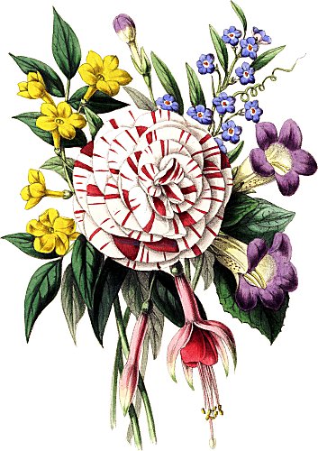 I would recommend the early spring flowers to be arranged in flower pots or in wicker baskets. In mixed groups, as a certain guide to those who do not like to trust to their own taste for blending colours, I would place lavender near pink; blue to red; white should approximate to scarlet, and yellow to purple. The small flowers particularly essential in separating the larger ones are white and yellow jasmine, nemophila cineraria, verbenas, myrtle, honeysuckle, etc., etc. The pendent flowers give great ease and elegance to a bouquet, and should be placed in first. The neck of the vase should be well filled with dried moss, which can be procured at the herbalists. Alabaster and glass vases are best adapted for the reception of wax bouquets, except when they are intended for the centre of a table, and then I prefer baskets of alabaster, wicker, or gilt; glass shades are requisite to cover either. All, or any of the last-named articles, I shall be happy to furnish to those who may kindly think proper to favour me with orders, addressed to my residence, 35, Rathbone Place.