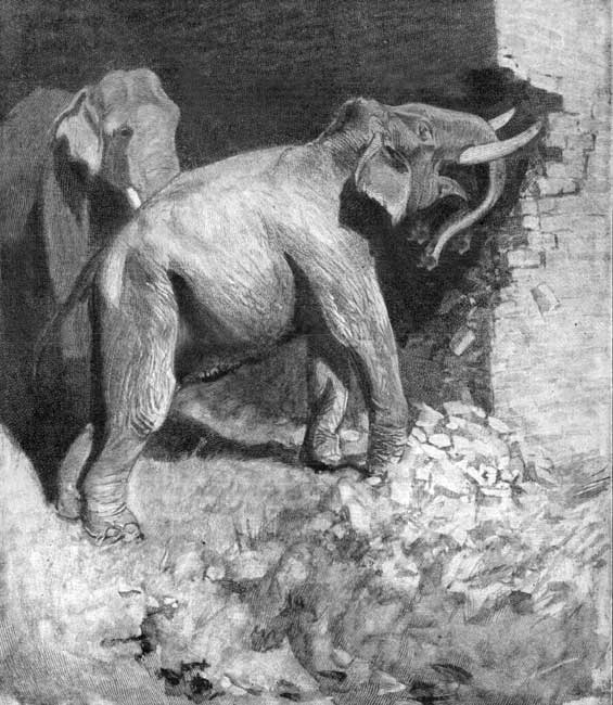 Fumble, fumble, fumble, went his nose against the iron bolt of the bin; but Tim was an expert burglar, and not easily discouraged. After many failures, his struggles were crowned by success, and Tim pressed up the lid with his strong, brown head until, with a dull thud, it feel back against the wall; then whisking his tail over his back, with a movement that expressed perfect satisfaction, Tim's head disappeared in the depths of the oats-bin.