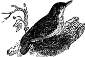 [126]This bird is easily tamed, and I will conclude with an account of one kept by a clergyman, that is related by Professor Rennie. "It lived chiefly on insects, but, as the winter drew on these failed, and necessity compelled the poor bird to approach the house, from which it had previously remained at a distance, and a servant, hearing its feeble cry, as if it were asking charity, opened for it the door of the back kitchen. It did not venture far at first, but it became daily more familiar and emboldened as the cold increased, till at length it actually entered the kitchen, though already occupied by a dog and a cat. By degrees it at length came to so good an understanding with these animals, that it entered regularly at nightfall, and established itself at the chimney corner, where it remained snugly beside them for the night; but as soon as the warmth of spring returned, it preferred roosting in the garden,[127] though it resumed its place at the chimney corner the ensuing winter. Instead of being afraid of its two old acquaintances, the dog and cat, it now treated them as inferiors, and arrogated to itself the place which it had previously obtained by solicitation. This interesting pet was at last choked by a bone which it had swallowed."