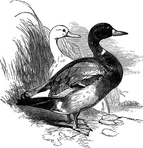 As to the use we make of ducks, it is chiefly as an article of food the English duck is prized. But in the Northern regions, particularly in Iceland, there is a bird called the eider duck, which is much valued on account of the soft and[22] beautiful down which grows upon its breast, and is used for pillows and counterpanes, being wonderfully light, warm and elastic. These birds, though naturally solitary creatures, assemble in crowds at the breeding season, and build their nests in the roofs of the houses. They tear away this soft down as a cradle for their young. But the people rob the nests when they are finished, not only once, but sometimes, cruelly enough, a second time. For the poor birds, finding the down gone, tear a second supply from their loving bosoms. If the plunder be attempted more than twice, the birds are said to forsake the spot entirely. The eider duck has a curious method of teaching her young ones to swim. A few days after they are hatched she carries them some distance from shore on her back. Then, making a sudden dive, she leaves[23] the little ones afloat and obliged to exert their own powers. Re-appearing at a little distance, she entices them towards her, and thus they at once become good swimmers.