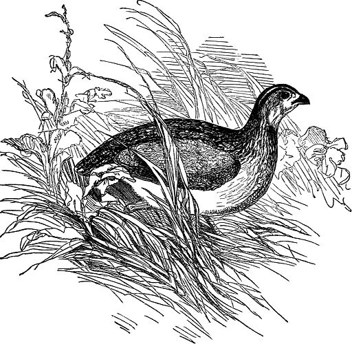 THE QUAIL.The quail is the smallest of the poultry tribe, and is a pretty little bird, something like a partridge, but not so large. I dare say you have sometimes seen quails alive in a poulterer's shop, where they are often displayed in long narrow cages, and are sadly crowded together. The quail is a migratory bird, except in those countries blessed with an equable temperature, such as Italy, Portugal, etc., where it is to be found in all seasons. In warm weather the quail visits our island, but nearly all those sold in London are brought from France, where they are caught in hundreds by means of a quail-pipe as it is called. This is a little instrument which imitates the cry or call of the[28] quail so successfully that the bird is deceived, and, following the note, is easily ensnared. Africa is the head-quarters of quails in the winter, but in the summer they come in vast flocks and take up their abode in Europe and Asia. In the Crimea and Egypt they are caught in immense numbers whilst exhausted by their long flight. We are told in Stade's Travels in Turkey, that, "near Constantinople in the migrating season, the sun is often nearly obscured by the prodigious flights of quails, which alight on the coasts of the Black Sea, near the Bosphorus, and are caught by means of nets spread on high poles, planted along the cliff, some yards from its edge, against which the birds, exhausted by their passage over the sea, strike themselves and fall." The Arabs also catch quails by thousands in nets, when they visit Egypt, about harvest time. The[29] observations of modern travellers have confirmed in a very interesting manner the account given us of quails in the Bible. Do not you remember reading of the multitude of quails that were sent by God as food for the children of Israel whilst wandering in the desert, when they grew tired of the sweet manna God had rained upon them from heaven, and desired flesh? "They gathered the quails," we are told, in great quantities, "and they spread them all abroad for themselves round about the camp."—Numbers xi. 32. This was done in order to dry them, and this method of preserving not only quails, but other flesh and fish, is still followed by the Arabs. There is one particular island off the coast of Egypt where myriads of quails are caught, and, being stripped of their feathers, are dried in the burning sand for about a quarter of an hour, after which they[30] are sold for as little as a penny a pound. The crews of those vessels which in that season lie in the adjacent harbour, have no other food allowed them. The quails, when migrating, fly so near the ground that they are very easily knocked down and secured. The nest of the quail is very simple. It consists merely of a few dried sticks in a wheat-field, and contains from twelve to eighteen pretty little green and brown eggs. The quail itself is very prettily coloured with black, chestnut, yellow, and white, and the males have a black collar round their throats. The old Romans would not eat the flesh of the quail, because it feeds on the grains of a poisonous plant. But we moderns are not so scrupulous, and find it very delicious food. I am sorry to tell you this little bird is so fond of fighting that there was an old proverb, "as quarrelsome as[31] quails in a cage." And the Greeks and Romans kept quails on purpose to see them fight, as some people did formerly (I hope not now), game-cocks. Even to this day this is the custom in India and China.