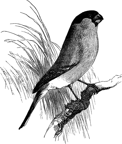 Bullfinches that are perfect in their song, are worth a great deal of money. Both the male and female sing, but the colours of the male are[46] the brightest. These birds, however, in confinement, lose their brilliancy of hue, and, from growing duskier and duskier, sometimes become entirely black, as if putting on mourning for their lost liberty. The same change has been observed in a bird which lost its mate to whom it had been tenderly attached. It is principally for its power of imitation and memory that this bird is prized. His wild notes, when loud, are not particularly sweet, but at times are very soft and plaintive.