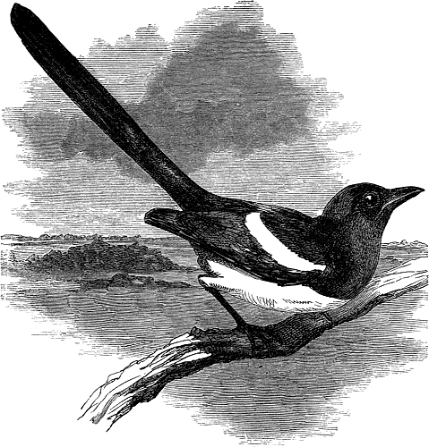 THE MAGPIE.The Magpie is a very pretty and cunning bird. It is easy to teach it to speak, and it may be rendered very tame. Where high trees abound, the magpie chooses the very highest and most difficult to climb for its nest. But otherwise, when secure of not being injured, it will often build in low bushes round about houses. This is particularly the case in Norway and Sweden, where an idea prevails that it is unlucky to kill them.