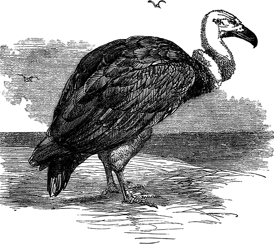 The vulture is wonderfully fitted by nature for the part it has to fill as "scavenger" abroad, this being the name they often go by. It is large and strong, so that the carcase of a horse or a buffalo is not too much for it to attack. Its legs are strong, but not armed with sharp claws like those of birds that feed on living prey. Its wings are long and wide, and its bones, though thick,[113] unusually light, so that the bird can remain an immense time poised in the highest regions of the atmosphere. Its beak is strong and hooked, and remarkably well formed for tearing or dividing, and what is still more noticeable, the head and neck which, from the disgusting nature of its food, must often be buried in unclean carcases, are quite, or very nearly, destitute of feathers, which, in such a situation, would be soon covered with dirt or blood, and could not be kept clean by the bird's own bill. The smell of vultures is, as may be supposed, very offensive, and they are altogether very disagreeable birds to have anything to do with; but they are appointed to fill a particular office in the world, and are found invaluable in performing it.