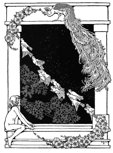 Hearing him say this, said the Peacock "I flew into the branches of a dark, dark tree. And as I rested there the fair lady who walked about the Garden—White-as-a-Pearl she was called and she was the Magician's daughter—walked under the dark, dark trees, and I saw that she was weeping.