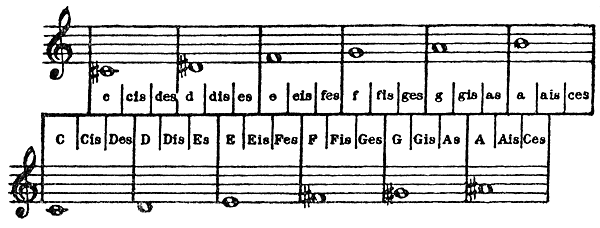 Nennen wir, um sie irgendwie zu unterscheiden, den ersten Ton C und die beiden nächsten Dritteltöne Cis und Des; den ersten Halbton (klein-)c und seine folgenden Dritteile [44] cis und des; – die vorhergehende Tabelle erklärt alles Fehlende.