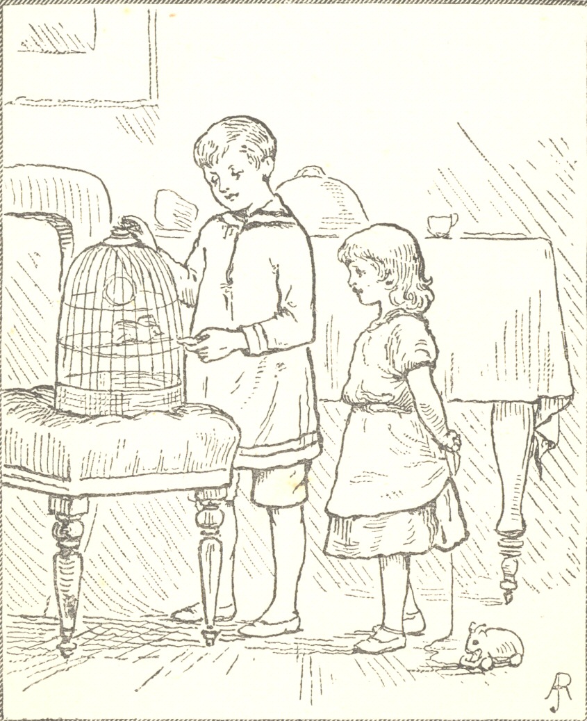 “There, mamma,” said Tit-bit and Frisky, “only see Jenny Wren and Cock Robin have been in at the bow-window, and it didn’t hurt them, and why can’t we go?”
