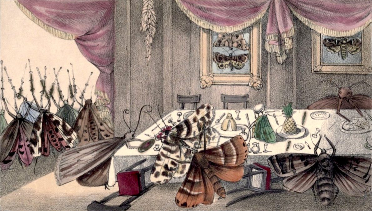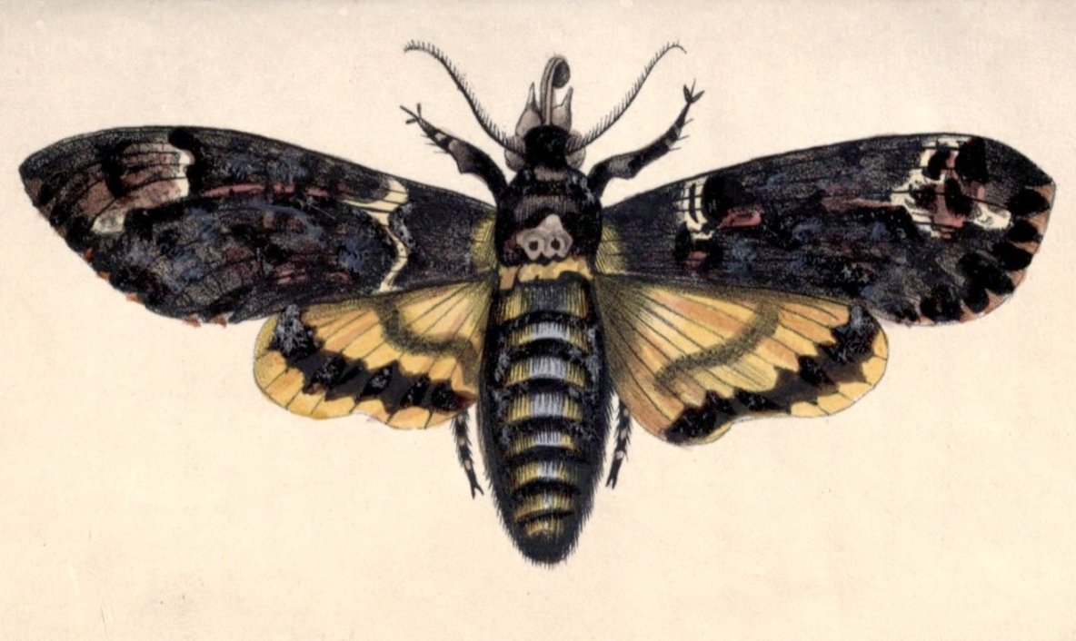 27 Sphinx atropos.—This is called the Death’s Head moth from the resemblance of the spot on its thorax to a human skull. It is the largest of the Sphinx tribe, and is vulgarly regarded as the messenger of pestilence and death. When touched it utters a plaintive cry, like that of a bat or mouse. Reaumur says, that a whole convent in France was thrown into consternation, by one of these moths flying into the dormitory. It frequently robs hives, and Huber states, that its cry renders the bees motionless. It breaks from its chrysalis between four and seven in the afternoon, as the Hawk moth of the Lime always appears at noon, and that of the Evening Primrose at sunrise.