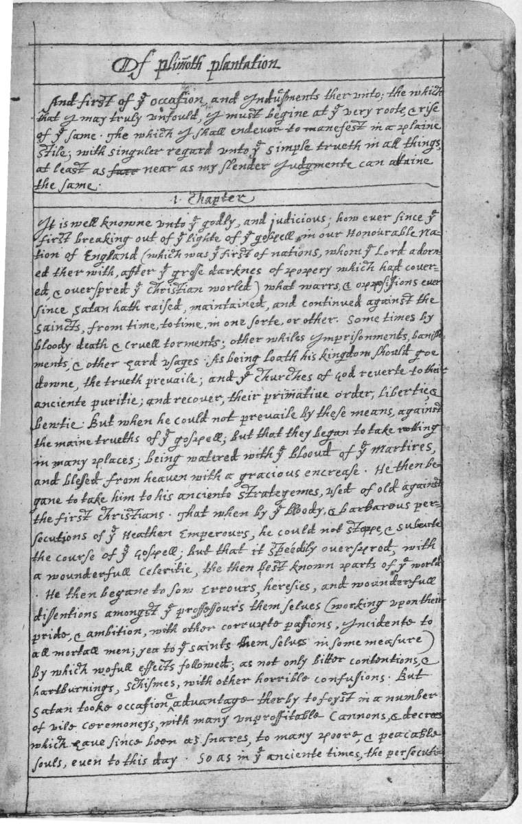 Calling at Major John Bradford's at Kingston near Plimouth, son of Major Wm. Bradford formerly Dep Gov'r of Plimouth Colony, who was eldest son of Wm. Bradford Esq their 2nd Gov'r, & author of this History; ye sd Major John Bradford gave me several manuscript octavoes wh he assured me were written with his said Grandfather Gov'r Bradford's own hand. He also gave me a little Pencil Book wrote with a Blew lead Pencil by his sd Father ye Dep Gov'r. And He also told me yt He had lent & only lent his sd Grandfather Gov'r Bradford's History of Plimouth Colony wrote by his own Hand also, to judg Sewall; and desired me to get it of Him or find it out, & take out of it what I thought proper for my New-England Chronology: wh I accordingly obtained, and This is ye sd History: wh I found wrote in ye same Handwriting as ye Octavo manuscripts above sd.