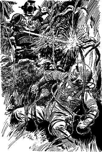As if in answer, a tree beside him breathed fire, then exploded. In the brief flash of the blaster shot, Alan saw the steel glint of a robot only a hundred yards away, much nearer than he had thought. "Thank heaven for trees!" He stepped back, felt his foot catch in something, clutched futilely at some leaves and fell heavily.