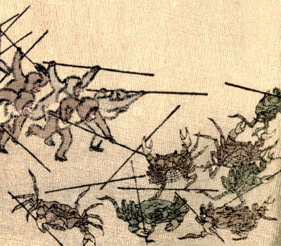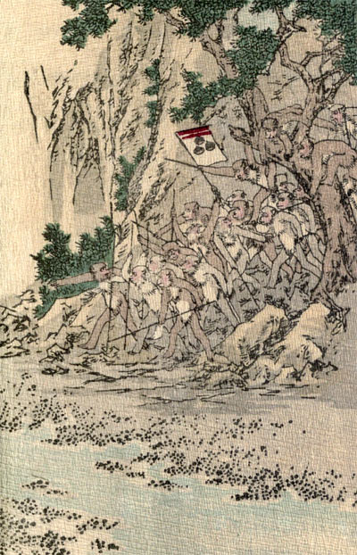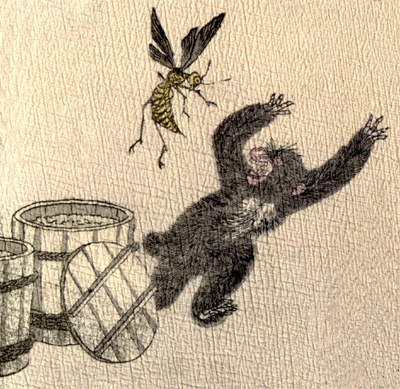 First, they requested that peace be made with the crabs; and thus they induced the king of the monkeys to enter their hole unattended, and seated him on the hearth. The monkey not suspecting any plot, took the hibashi, or poker, to stir up the slumbering fire, when bang! went the egg, which was lying hidden in the ashes, and burned the monkey's arm. Surprised and alarmed he plunged his arm into the pickle-tub in the kitchen to relieve the pain of the burn. Then the bee which was hidden near the tub stung him sharply in his face already wet with tears.