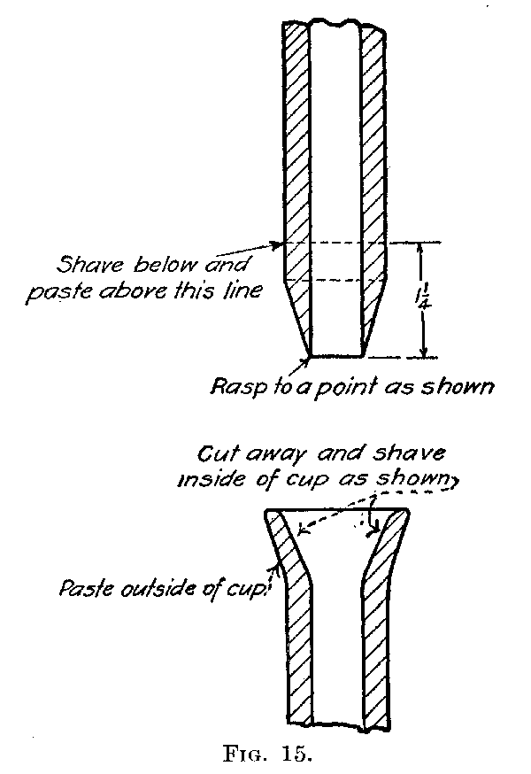 Cup Joint.—The materials necessary for the work (Fig. 15): 12 inches of 1⁄2-inch AA lead pipe, paste, rosin, 1⁄2 and 1⁄2 solder.