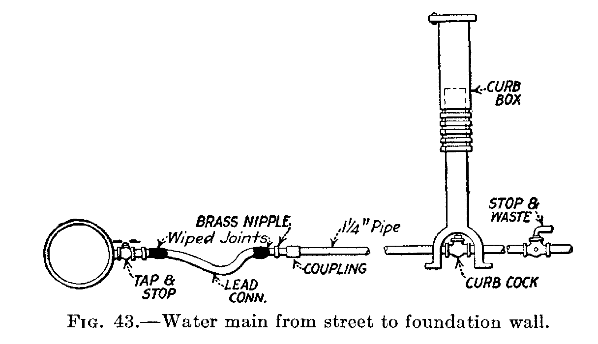 In the early years of the trade the question of the disposal of the waste water was easily answered, for it was allowed to be discharged onto the ground to seek its own course. But with the increased amount of water available, the waste-water problem has enlarged until today it plays the most[2] important part of plumbing, and the trade has had to change to meet this waste-water problem.