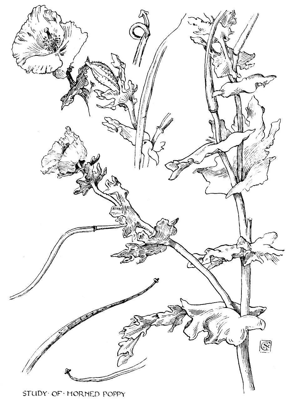 One of the best and simplest ways to ascertain the real value of a colour and its effect upon different grounds or fields is to take a flower—say a red poppy, and place it against a white paper ground, blocking in the local colour as relieved upon white, as near as may be to its full strength, with a brush, and defining the form as we go along. Then try the same flower upon grounds of different tints—green, blue, yellow—and it will be at once perceived what a different value and expression the same form in the same colour has upon different tinted grounds. A scarlet poppy would appear clearest and darkest upon white; it would show a tendency upon a blue ground to blend or blur at its edges, and also on yellow and green to a less extent.