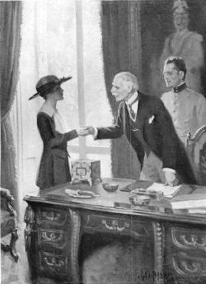 She put a finger to her lips in token of silence, and Renwick followed her gaze down the graveled path which led toward the arbor. As under-secretary of the British Embassy in Vienna, he had been trained to guard his emotions against surprises, but the sight of the three figures which were approaching them down the path left him bereft for the moment of all initiative. In the center walked the Archduke, pulling deliberately at his heavy dark mustaches while he listened to the figure upon his right, a man of medium stature, who wore a hunting suit and a jäger hat with a feather in it. He carried his left hand, concealing a defect of his arm, in the pocket of his shooting jacket, while with his free right hand he swung an ebony cane. His mustaches were turned straight upward from the corners of his mouth and the aggressive chin shot outward as he glanced right and left, talking meanwhile with his companions. The third figure was very tall, topping even the Archduke, who was by no means small of stature, by at least six inches; his hair, or as much of it as could be seen beneath the soft hat, was gray, and a long beard, almost white in the patches at either side of the chin, descended in two long points half of the way to his waist.