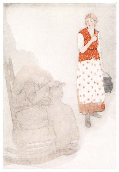 “What is the matter?” asked the woman from the bed. Then she slipped her hand under her pillow and drew out a box of salve. “Here! Rub the child’s eyes with a bit of this,” she said, “but be sure you do not get any of it on your own eyes, or it will be a bad thing for you,—scarce could be a worse.”