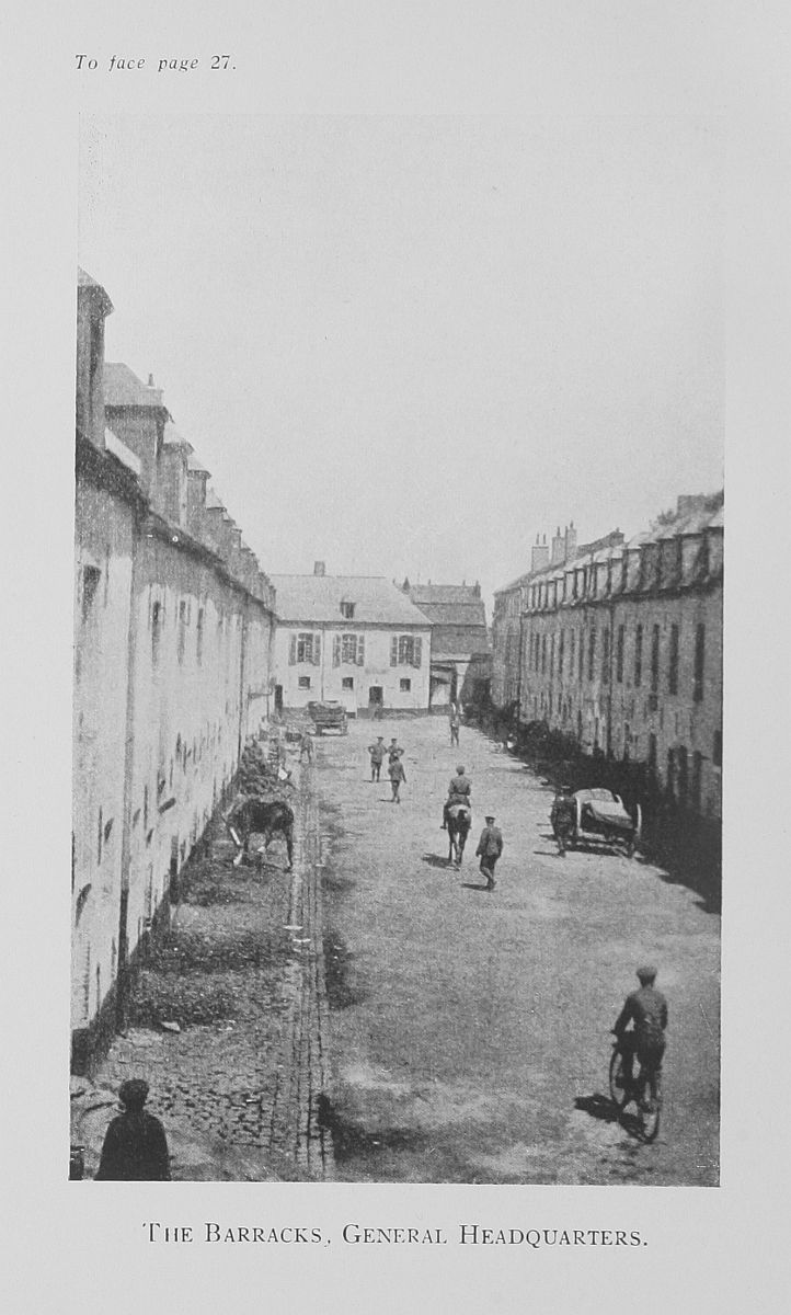 On arrival at General Headquarters it was found that the Battalion was not even expected, and no arrangements had been made for the night. After a wait of three hours in the train, the Battalion moved off into some old artillery barracks, which were destined to become more familiar later on. The quarters were, at that time, about as dismal and dirty as can be imagined.[10]