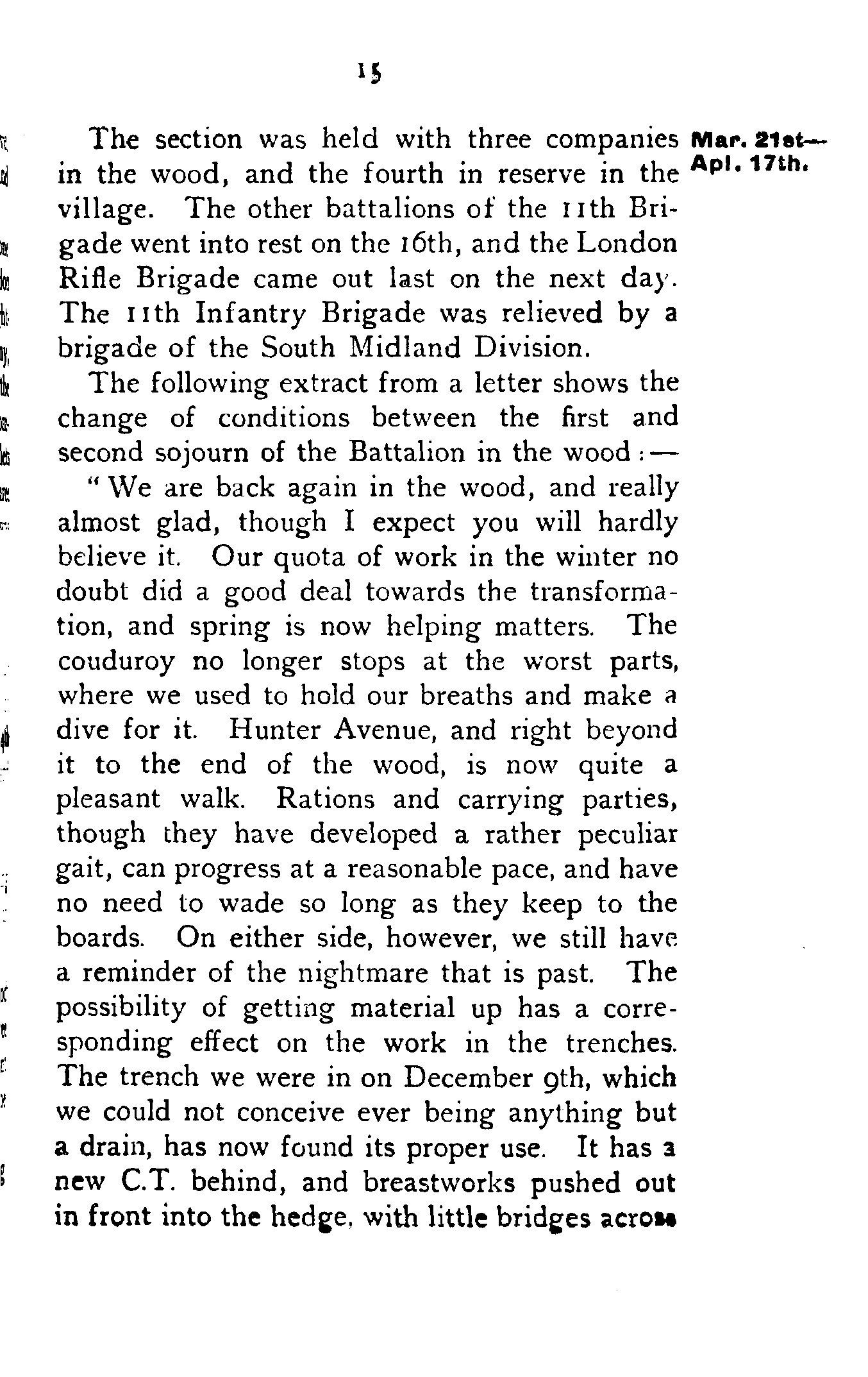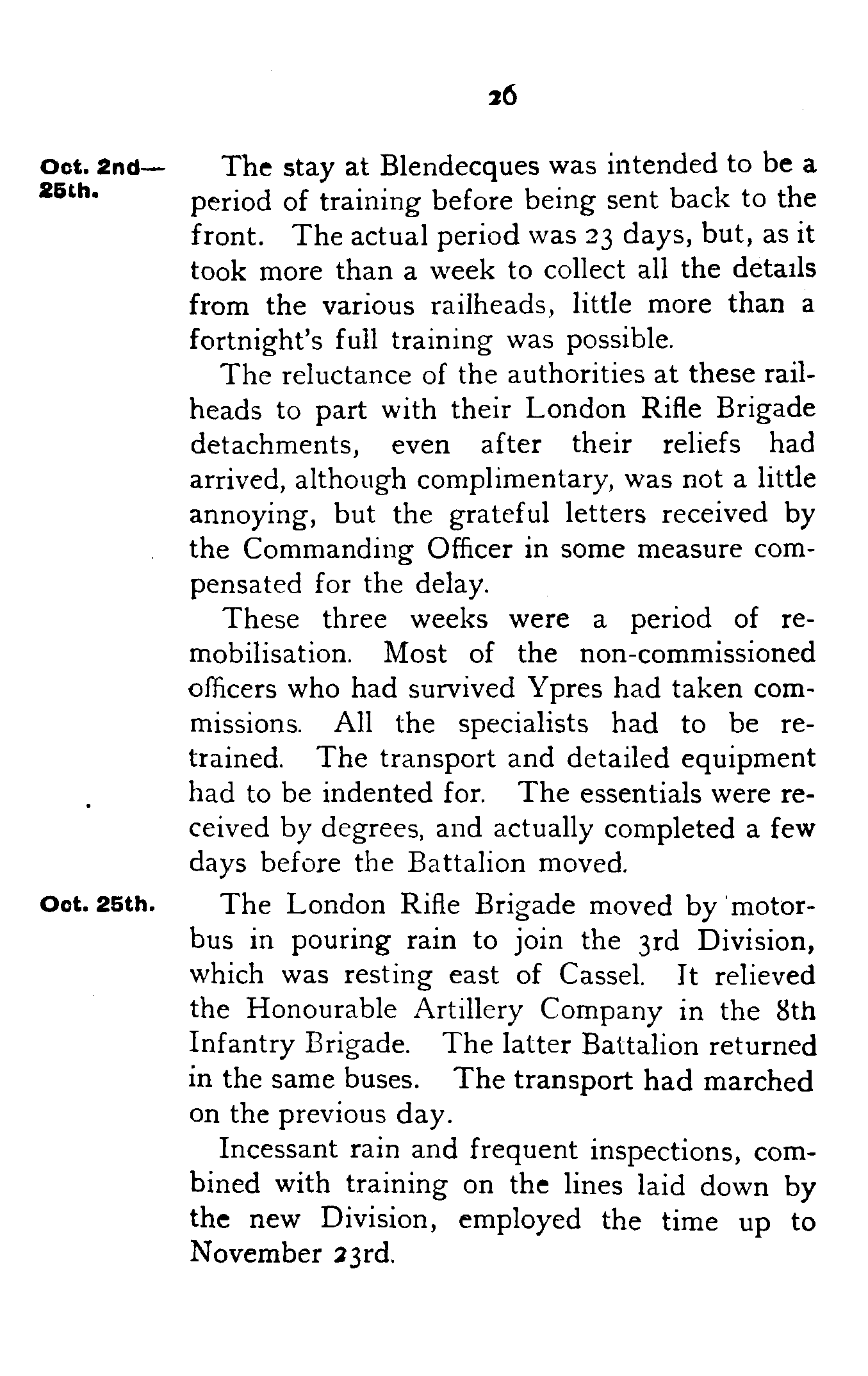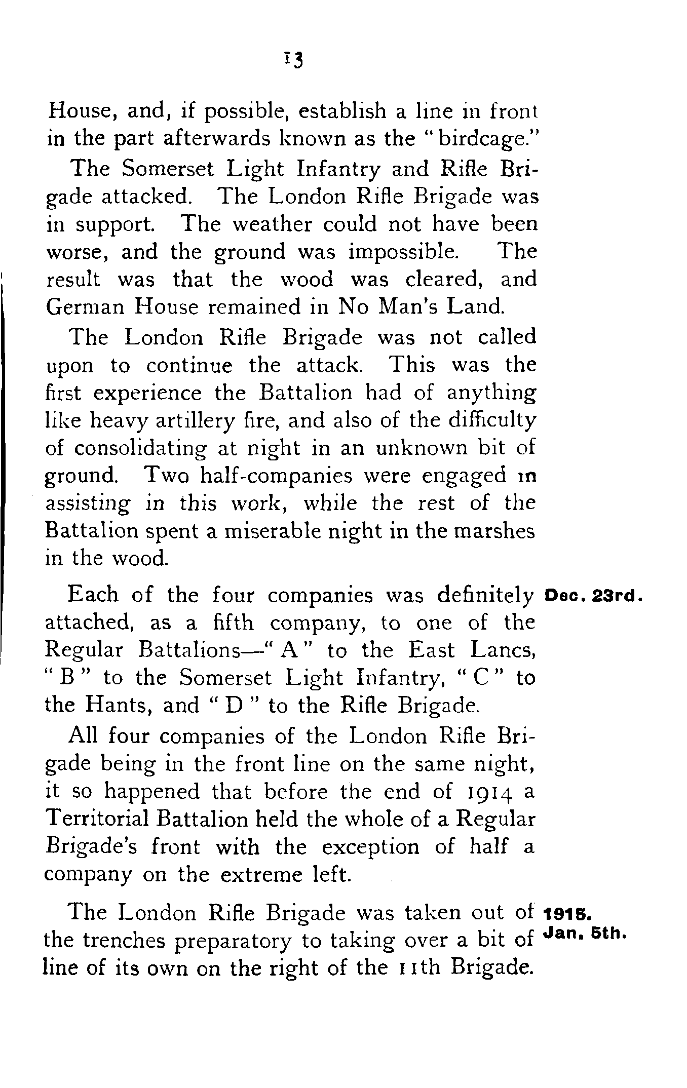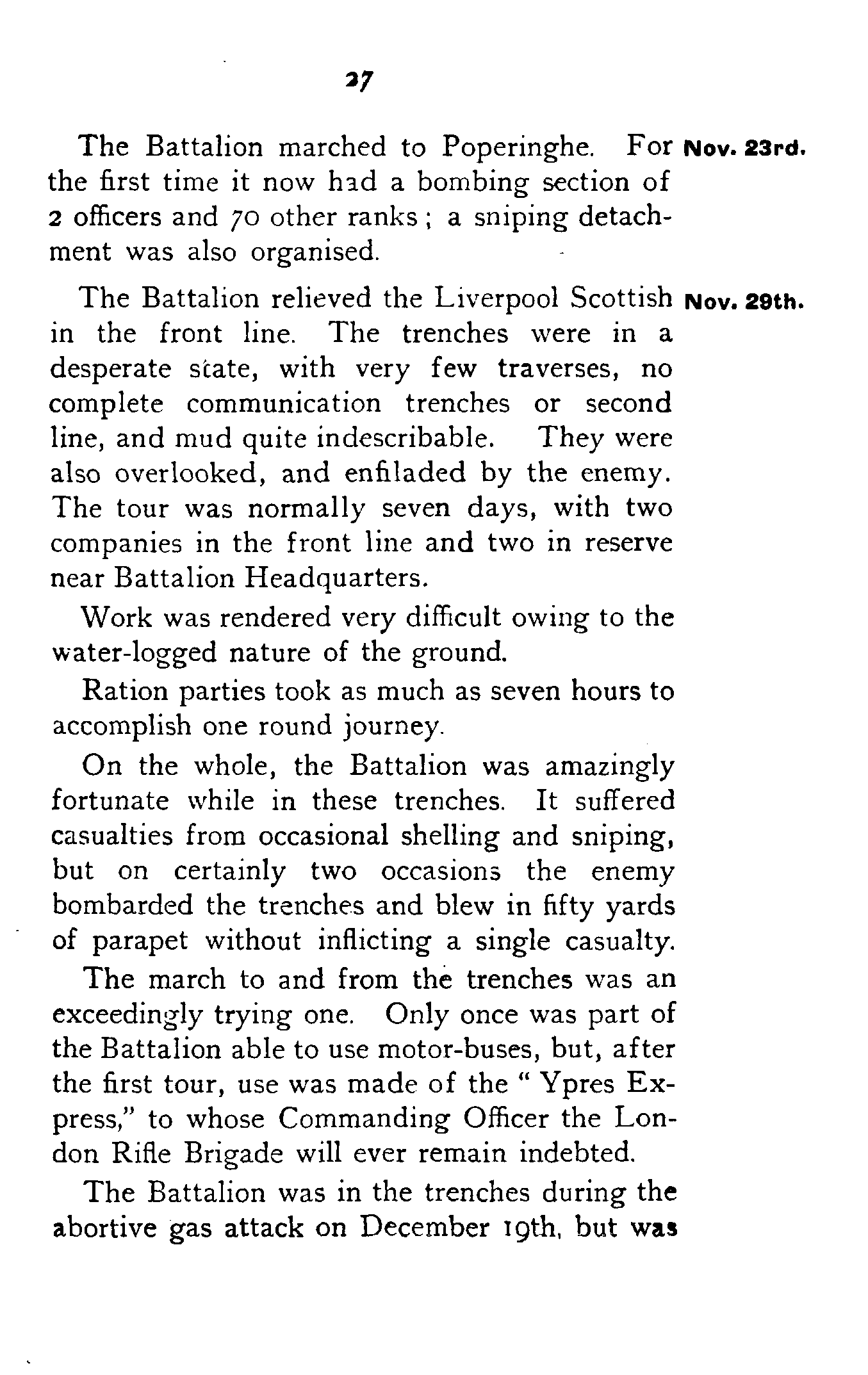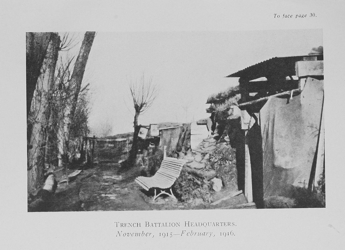 Up to December 18th the trench training of the London Rifle Brigade continued. Platoons and whole companies, gradually working more and more on their own, were attached to the Regulars. When not actually in the line, the whole day was invariably taken up with "fatigues" of all kinds.