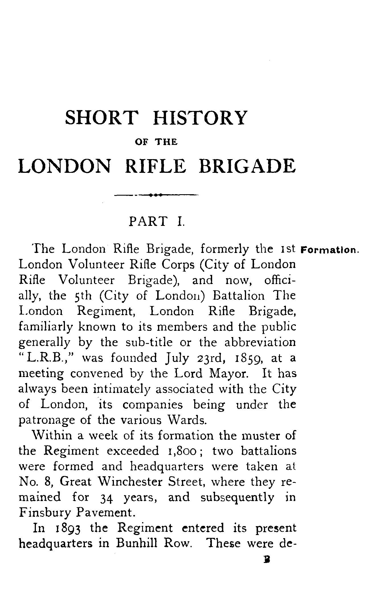 The London Rifle Brigade, formerly the 1st London Volunteer Rifle Corps (City of London Rifle Volunteer Brigade), and now, officially, the 5th (City of London) Battalion, The London Regiment, London Rifle Brigade, familiarly known to its members and the public generally by the sub-title or the abbreviation "L.R.B.," was founded July 23rd, 1859, at a meeting convened by the Lord Mayor. It has always been intimately associated with the City of London, its companies being under the patronage of the various Wards.