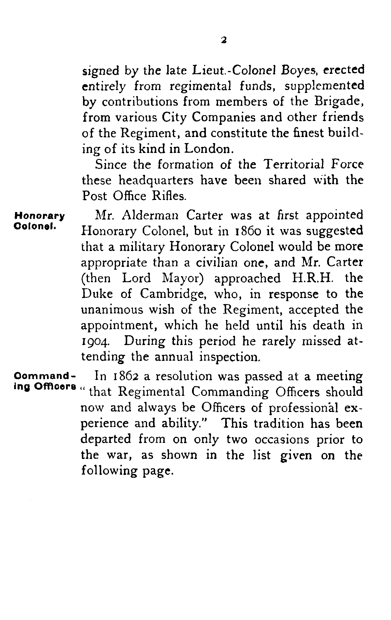 Mr. Alderman Carter was at first appointed Honorary Colonel, but in 1860 it was suggested that a military Honorary Colonel would be more appropriate than a civilian one, and Mr. Carter (then Lord Mayor) approached H.R.H. the Duke of Cambridge, who, in response to the unanimous wish of the Regiment, accepted the appointment, which he held until his death in 1904. During this period he rarely missed attending the annual inspection.