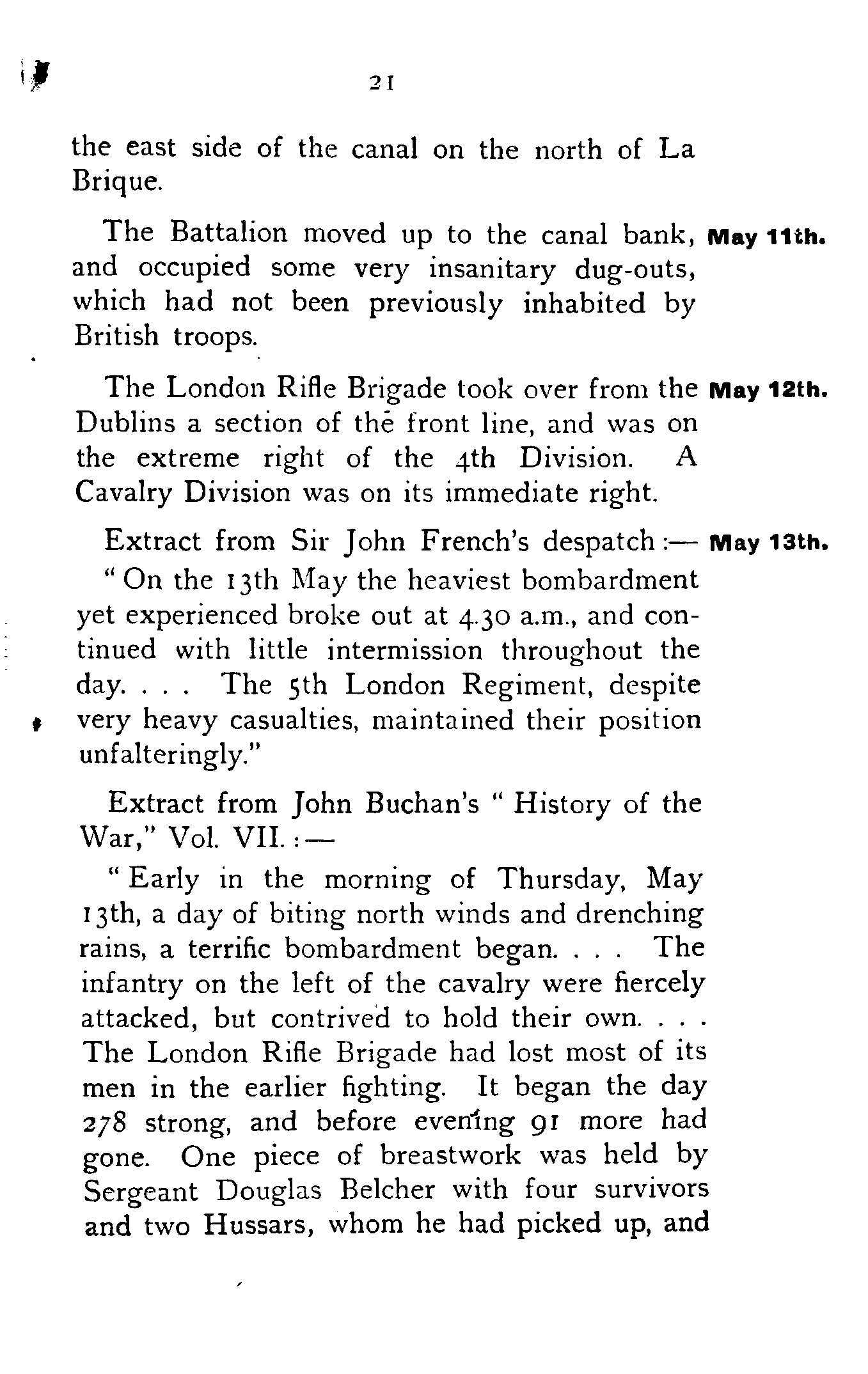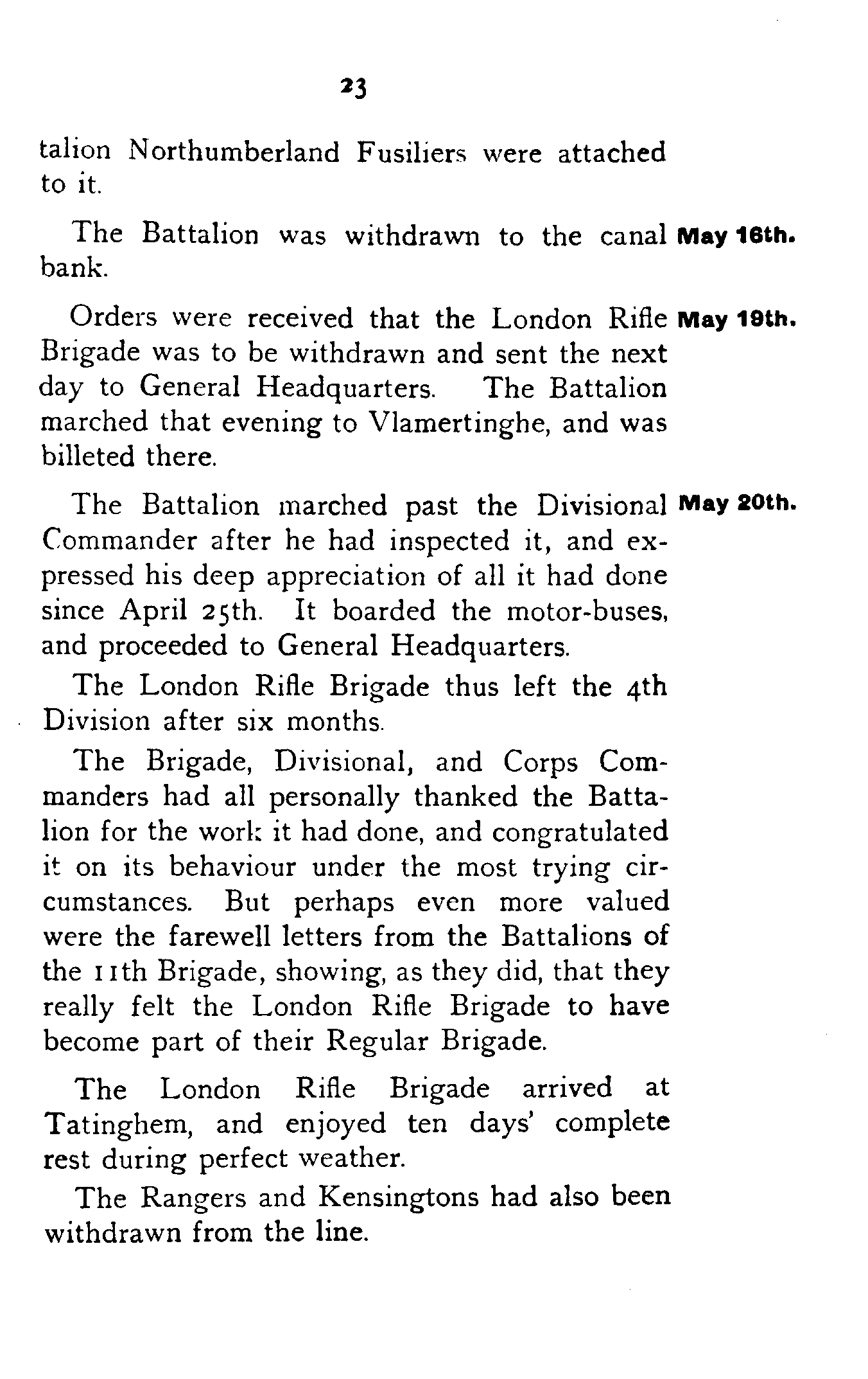 Brigadier-General Hunter Weston paid the Battalion a visit, and addressed the Officers. He gave a short account of the 11th Infantry Brigade, which he commanded, and to which the London Rifle Brigade was attached, and outlined the scheme of training. Half-companies were to be attached to Regular Battalions for a spell in the trenches, the men being scattered amongst the Regulars. As soon as their worth had been proved, half-companies were to be put in the line intact, and later whole companies.