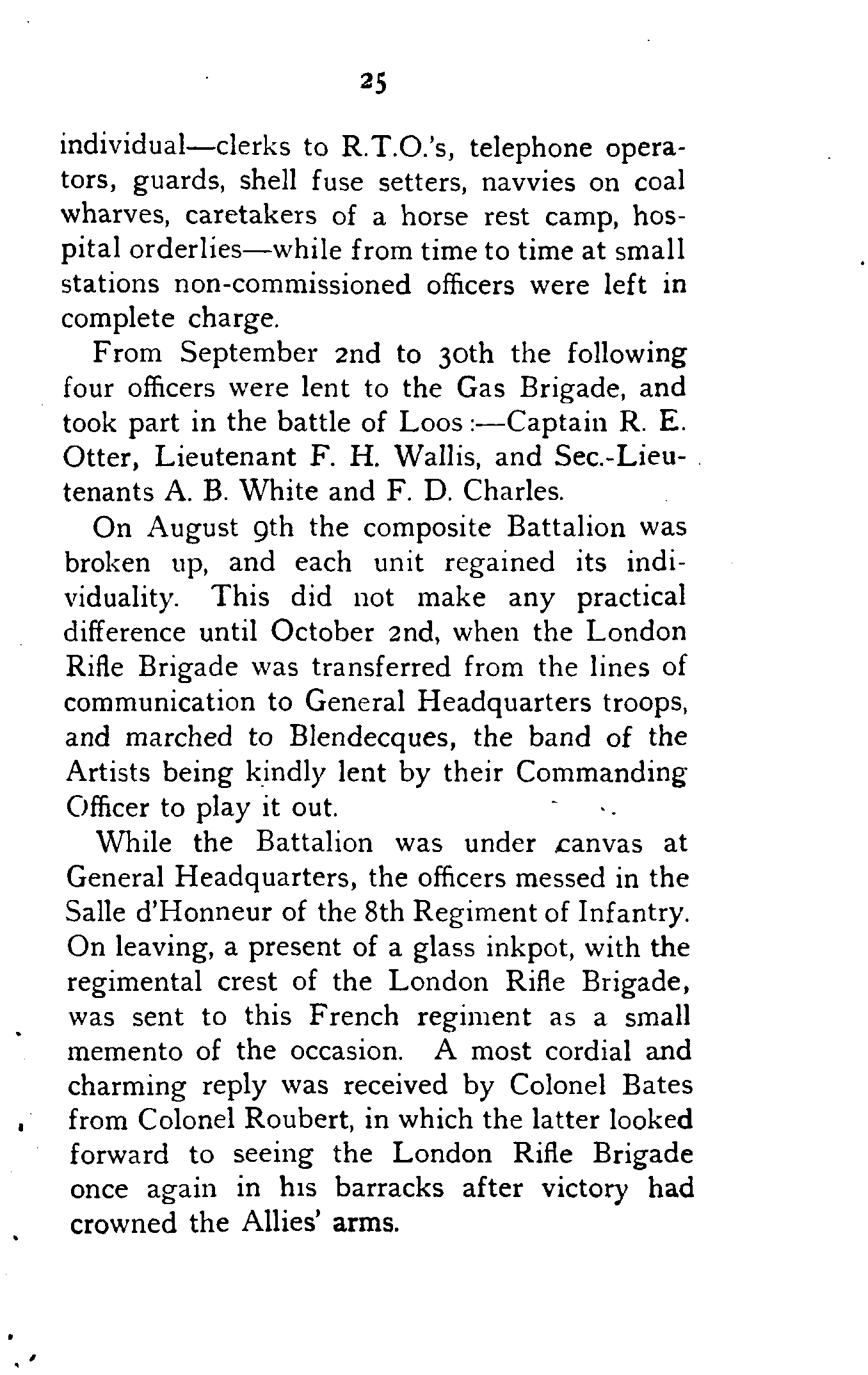 Except for bruised feet, the march next day, about 11 miles, was not very trying. Two nights were spent at this town, where the Artists and Honourable Artillery Company were also in billets.