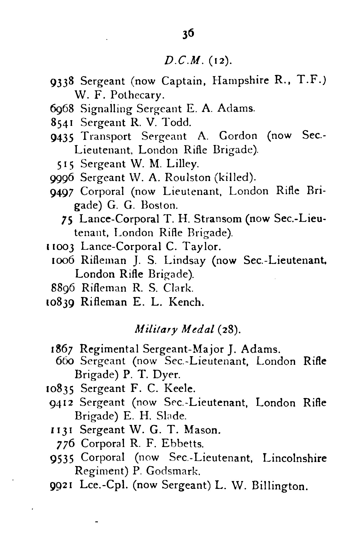 | Norman C. King (Ex London Rifle Brigade) | 1915 | |