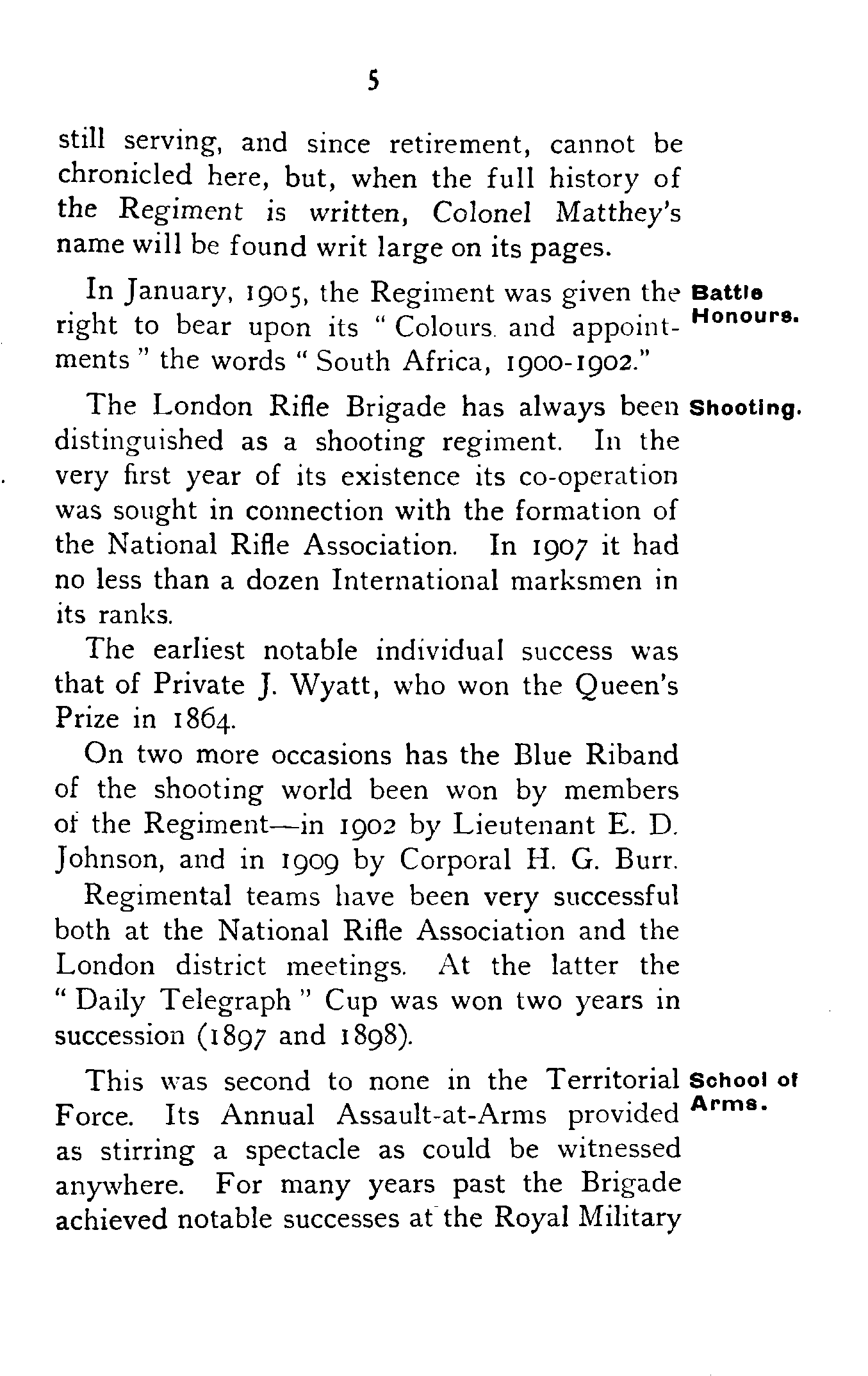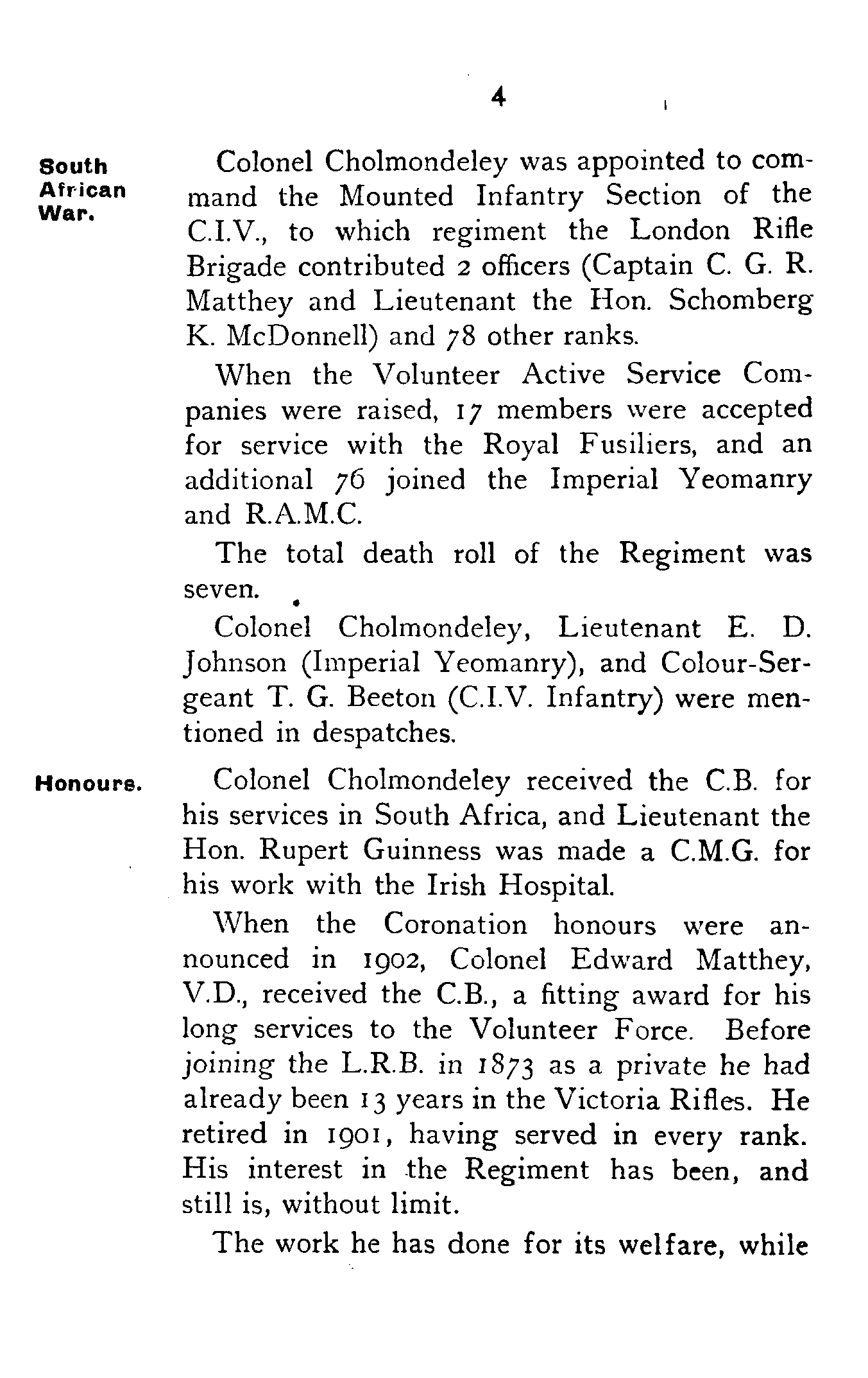 The work he has done for its welfare, while[5] still serving, and since retirement, cannot be chronicled here, but, when the full history of the Regiment is written, Colonel Matthey's name will be found writ large on its pages.