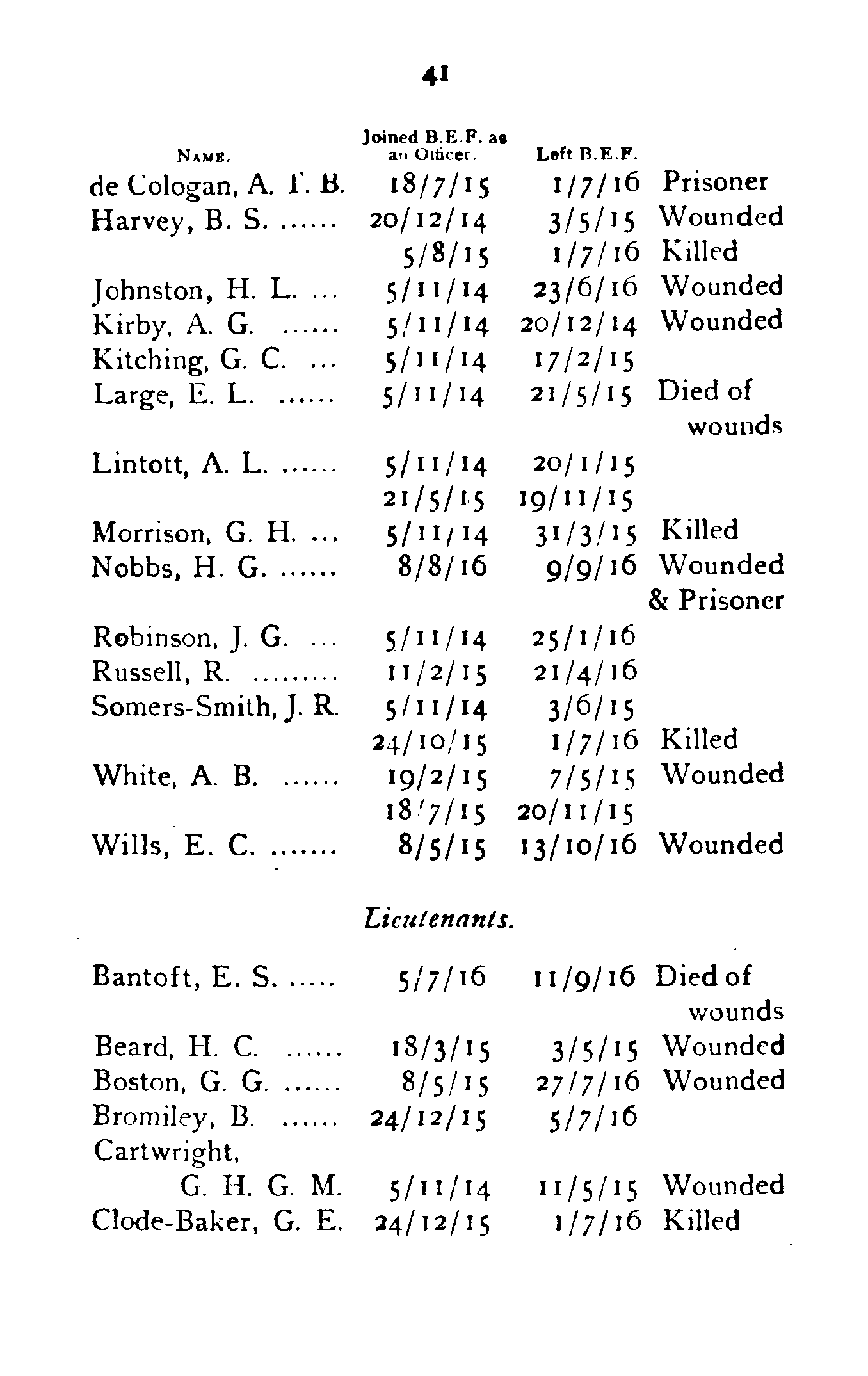 | Lieut. Edmunds | 27/2/15 | 28/4/15 | Wounded |
