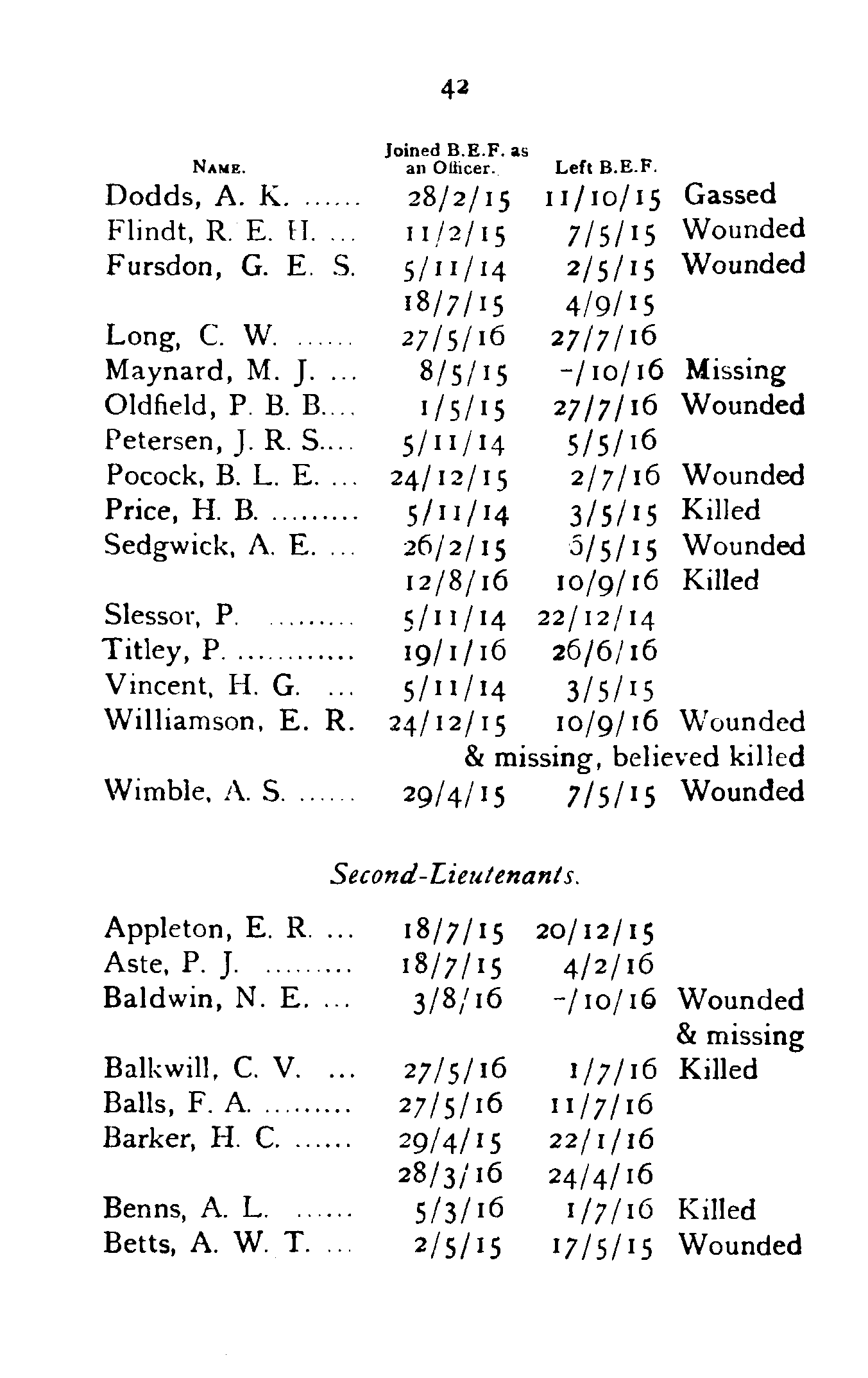 | Petley, R. E. | 27/5/16 | 1/7/16 | Wounded |