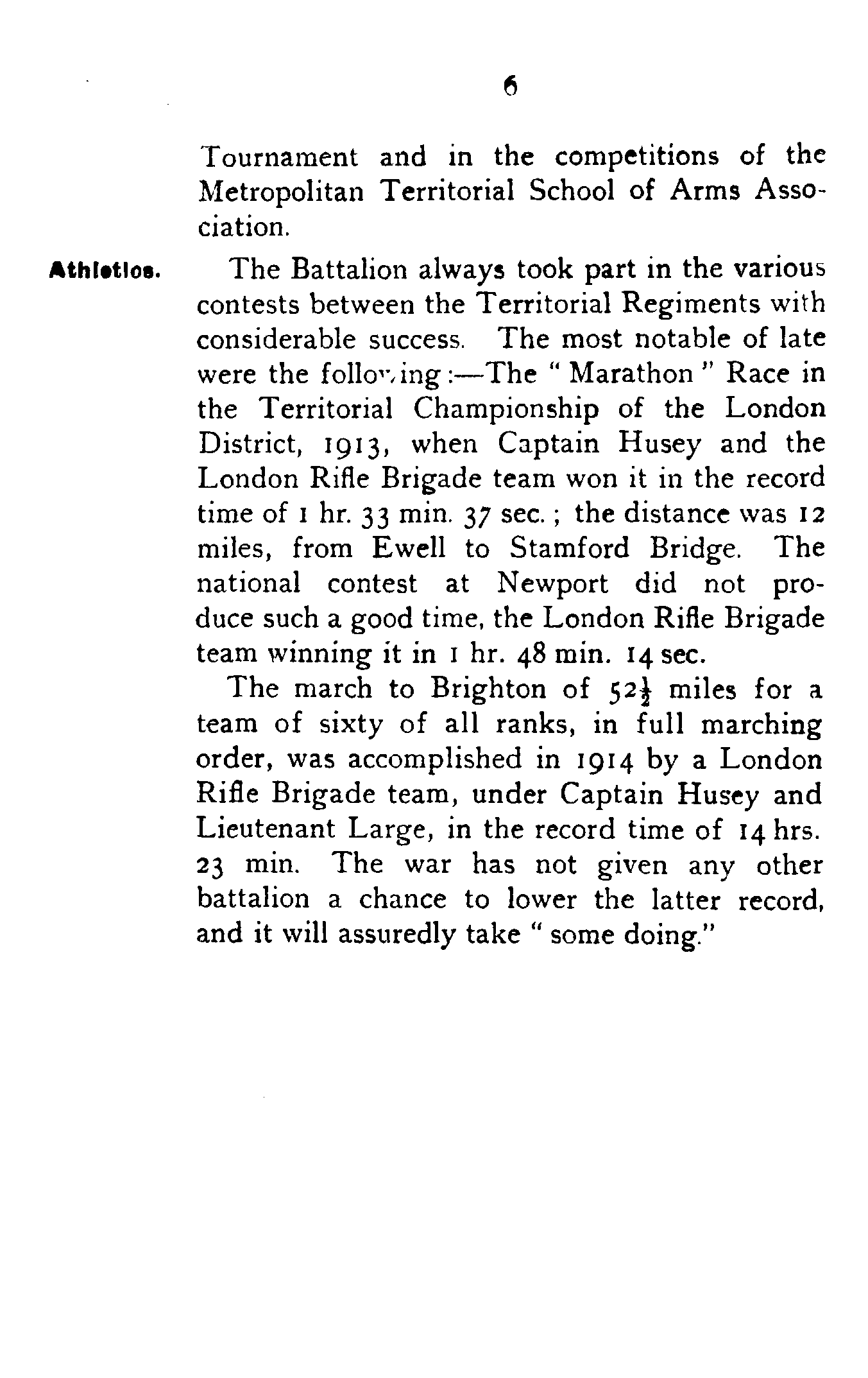 The Battalion always took part in the various contests between the Territorial Regiments with considerable success. The most notable of late were the following:—The "Marathon" Race in the Territorial Championship of the London District, 1913, when Captain Husey and the London Rifle Brigade team won it in the record time of 1 hr. 33 min. 37 sec.; the distance was 12 miles, from Ewell to Stamford Bridge. The national contest at Newport did not produce such a good time, the London Rifle Brigade team winning it in 1 hr. 48 min. 14 sec.