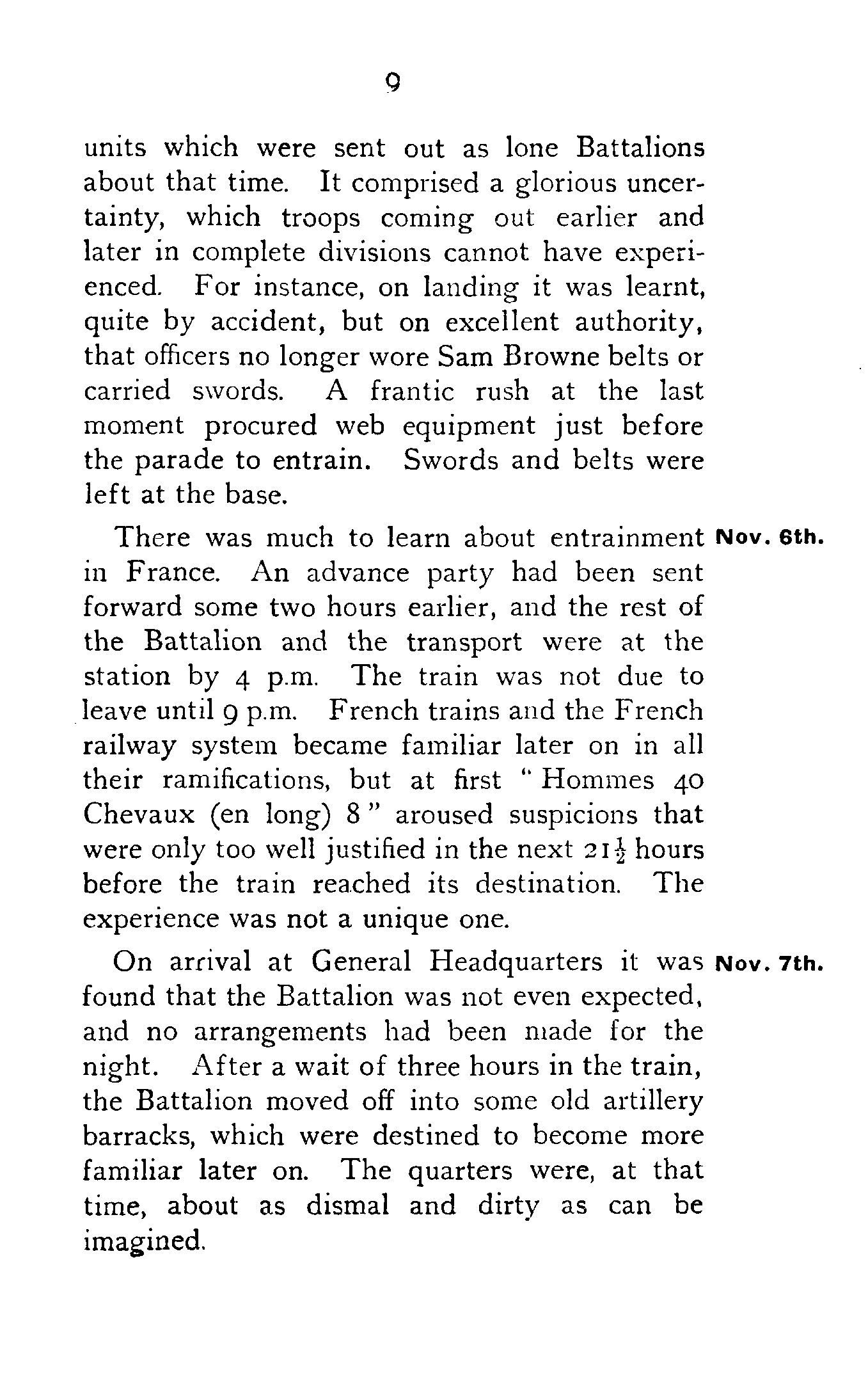 There was much to learn about entrainment in France. An advance party had been sent forward some two hours earlier, and the rest of the Battalion and the transport were at the station by 4 p.m. The train was not due to leave until 9 p.m. French trains and the French railway system became familiar later on in all their ramifications, but at first "Hommes 40 Chevaux (en long) 8" aroused suspicions that were only too well justified in the next 21½ hours before the train reached its destination. The experience was not a unique one.