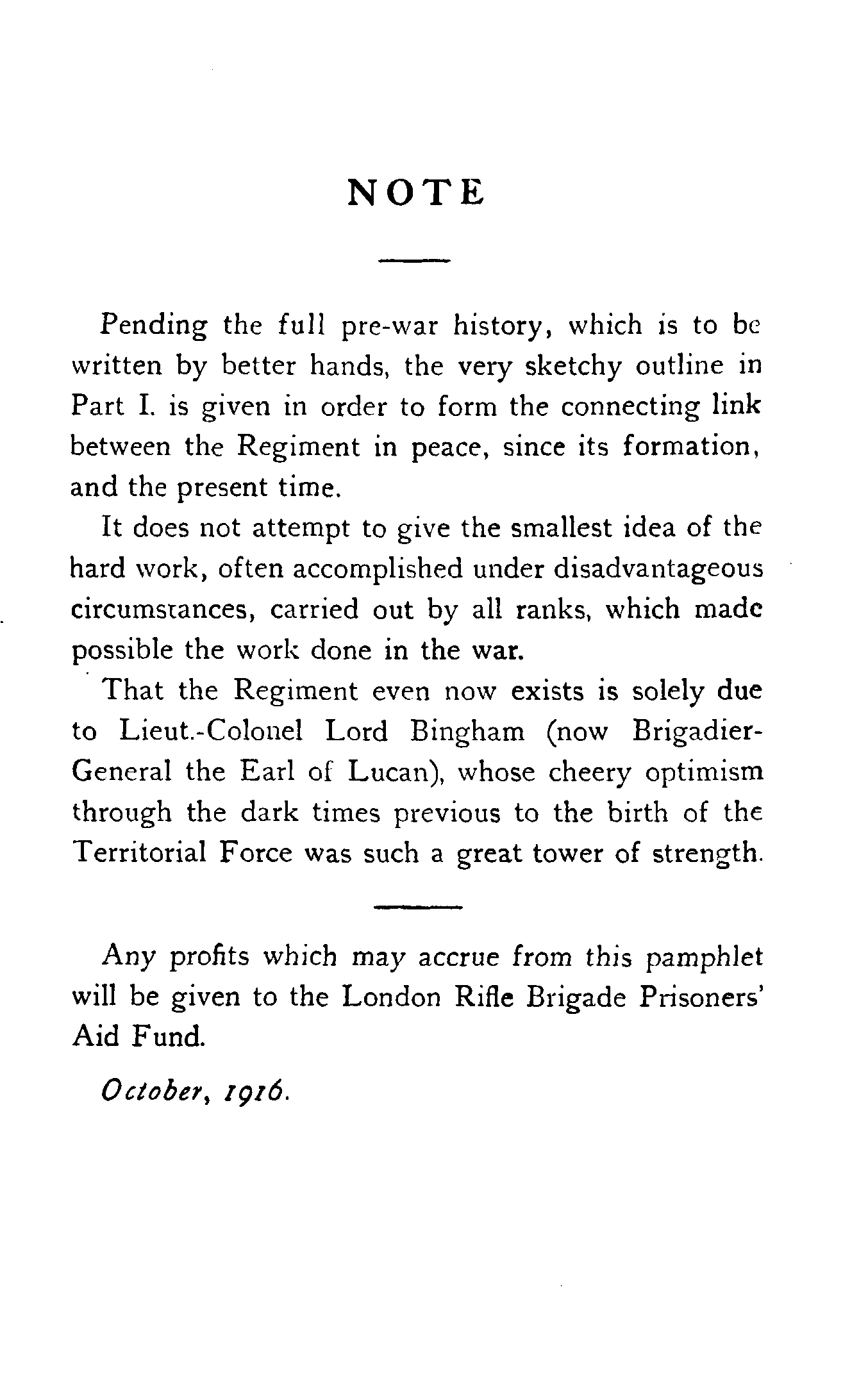 Any profits which may accrue from this pamphlet will be given to the London Rifle Brigade Prisoners' Aid Fund.