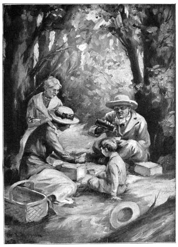 “Oh, spiders and ants and little creatures like that like to come to a picnic,” answered Grandpa, scooping up the spider on a bit of cardboard and putting him down carefully on a bush near by. “Mr. Spider’ll go home to-night and tell the folks all about the little boy he saw in the woods to-day with his mother and his grandmother and his grandfather having a picnic. And little Sallie 208 Spider will say, ‘What were they eating, Daddy? Did you bring me any?’”