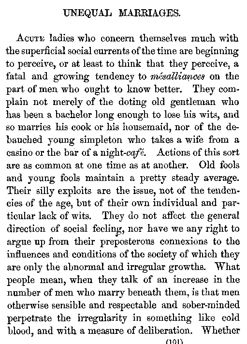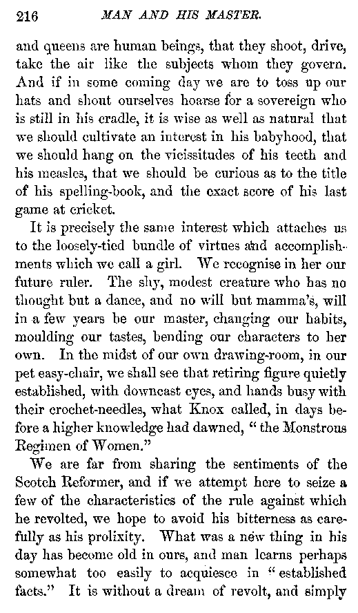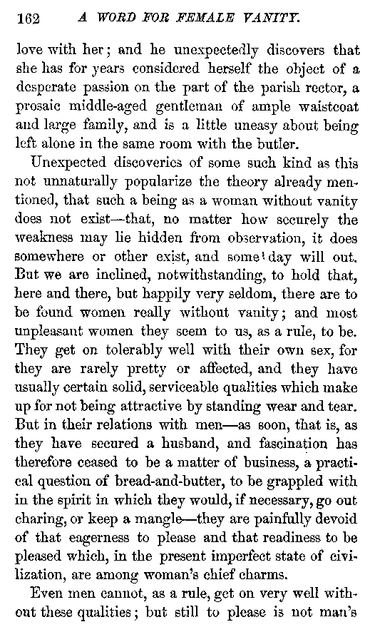 Spoilt women are spoilt mainly from a like cause—over-attention from men. A few certainly are to be found, as pampered daughters, with indulgent mammas and subservient aunts given up wholly to ruining their young charge with the utmost despatch possible; but this is comparatively a rare form of the disease, and one which a little wholesome matrimonial discipline would soon cure. For it is seldom that a petted daughter becomes a spoilt wife, human affairs having that marvellous power of compensation, that inevitable tendency to readjust the balance, which prevents the continuance of a like excess under different forms.