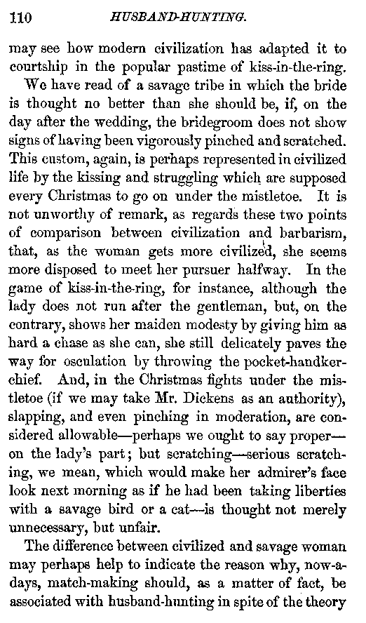 We have a right to suppose that women do not adopt a fashion or a costume unless they suppose that it will add to their attractions in general, and possibly also please men in particular. This being so, it may be well to observe that these fashions do not please or attract men, for we know they are but the inventions of some vulgar, selfish perruquier or modiste. We may add that if we want to study the nude we can do so in the sculpture galleries, or among the Tableaux Vivants, at our ease; and that for well-bred or well-educated and well-born women, or even for only fashionable and fast women, to approximate in their manners, habits, and dress to the members of the demi-monde is a mistake, and a grievous one, if they wish to be really and adequately appreciated by men whose good opinion, if not more, they would desire to possess.