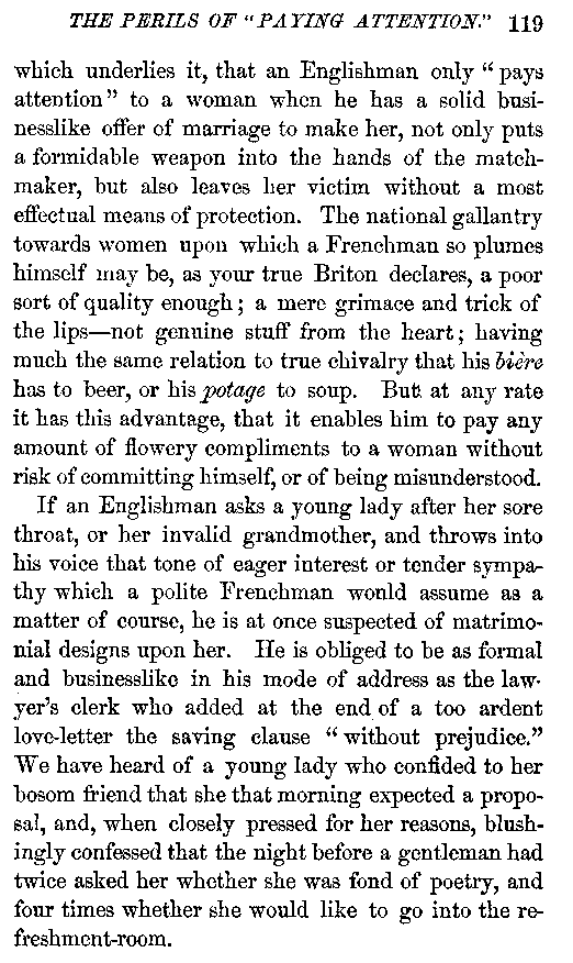 But art shades off into literature, and literature into poetry. We are driven into a confession that we enjoy the frivolous articles that those horrid papers have devoted to her sex. Is there nothing, the Pretty Preacher asks us solemnly, to be said against our own? And the sun is hot, and we are speechless. It was shameful of us to put down the Spanish Gipsy, and let it return unfinished to Mudie's! Never did rebuke so fill us with shame at our want of imagination and of poesy. But already the Preacher has passed to politics, and is deep in Mr. Mill's prophecies of coming events. She is severe on the triviality of the House, or the quarrelsome debates of the past Session. She passes by our murmured excuse of the weather, and dwells with a [361]temperate enthusiasm on the fact that the next will be a social Parliament. Do we know anything about the Poor-laws or Education or Trades'-societies? Have we subscribed to Mr. Mill's election? We plead poverty, but the miserable plea dies away on the contemptuous air.