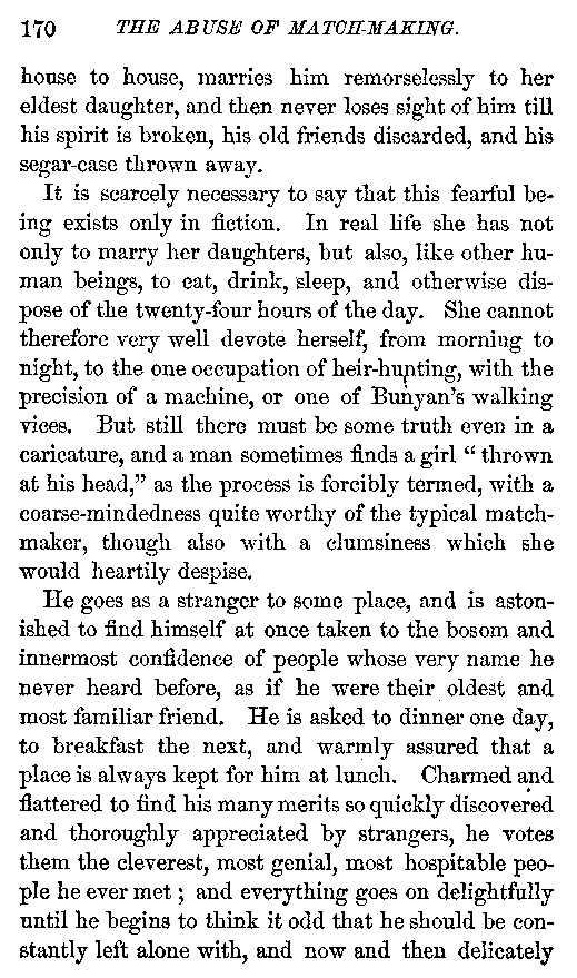 Time has no meaning for her; she is not neglecting [326]any work; she is only idle, as she always is idle. But love throws a new glory and a new interest around her indolence. The endless little notes with which she worries the Post-Office and her friends become suddenly sacred and mysterious. The silly little prattle hushes into confidential whispers. Every crush through the season, becomes the scene of a reunion of two hearts which have been parted for the eternity of twenty-four hours. Love, in fact, does not in the least change woman's life, or give it new earnestness or a fresh direction; but it makes it infinitely more interesting, and it heightens the enjoyment of wasting a day by a new sense of power. For that brief space of triumph Phyllis is able to make Corydon waste his day too. The more he writhes and wriggles under the compulsion, the more lingering looks he casts back on the work he has quitted, the greater her victory.