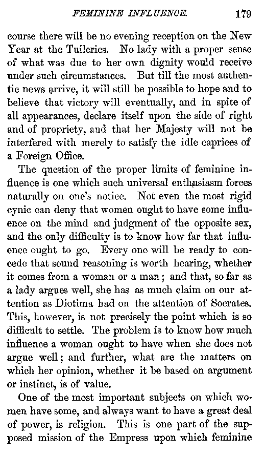 It is a good thing indeed, that any aspect of the "woman question" should claim place, week after week, in a leading English journal. It is a good thing that it has been thought wise to reprint these essays here. All this talk about the wrong ways of women suggests that there is a right way, as yet very much involved in the dust of discussion and the fogs of speculation. All these accusations against her folly imply a proportionate tribute to her possible wisdom, if once she can get a fair chance to be wise.