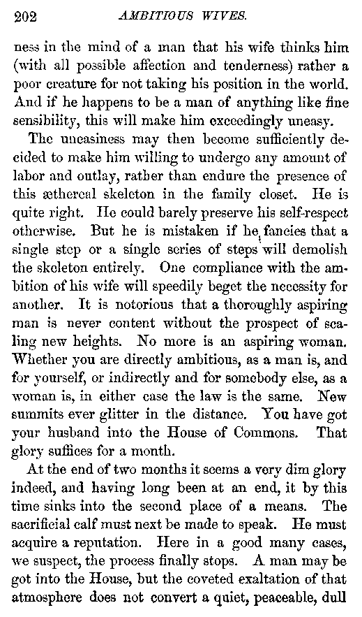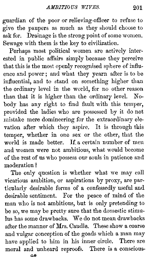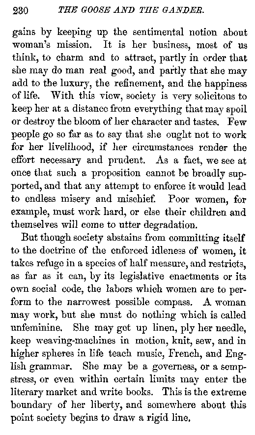 Woman may fairly object, we think, to abolish at one fell swoop such an ingenious fabric of idleness as this. A revolution in the whole system of social life, in the whole conception and drift of feminine existence, is a little too much to ask. As it is, woman wraps herself in her indolence, and is perfectly satisfied with her lot. She assumes, and the world has at least granted the assumption, that her little hands were never made to do anything which any rougher hands can do for them. Man has got accustomed to serve as her hewer of wood and drawer of water, and to expect nothing from her but poetry and refinement. It is a little too much to ask her to go back to the position of the squaw, and to do any work for herself. But it is worse to ask her to remodel the world around her, on the understanding that henceforth [325]duty and toil and self-respect are to take the place of frivolity and indolence and adoration.