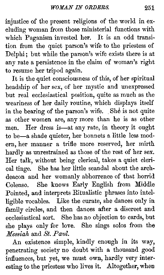 On the other hand, women really enjoy preaching. Mamma's reply to the natural inquiry as to the goodness of the sermon—"My dear, all sermons are good"—is something more than a matronly snub, it is the inner conviction of woman. She likes, not merely a talk, but a good long talk. She likes being abused. She likes being dogmatized over and intellectually trampled on. In fact, she has very little belief in the intellect. But then she has an immense faith in the heart. She lives in a world of affections and sympathies. She has her little tale of passion [358]in the past that she tells over to herself in the dusk of the autumn evening. She believes that the world at large is moved by those impulses of love and dislike that play so great a part in her own. And then, too, she has her practical house-keeping side, and likes her religion done up in neat little parcels of "heads" and "considerations" and "applications," and handed over the counter for immediate use. And so while papa quarrels with the rector's forty minutes, his indiscriminate censure of a world utterly unknown to him, his declamation against Pusey or Colenso, or while Charlie laughs over his rhetoric and his sentiment, woman listens a little sadly and wearily, and longs for a golden age when husbands will love sermons and men understand clergymen.