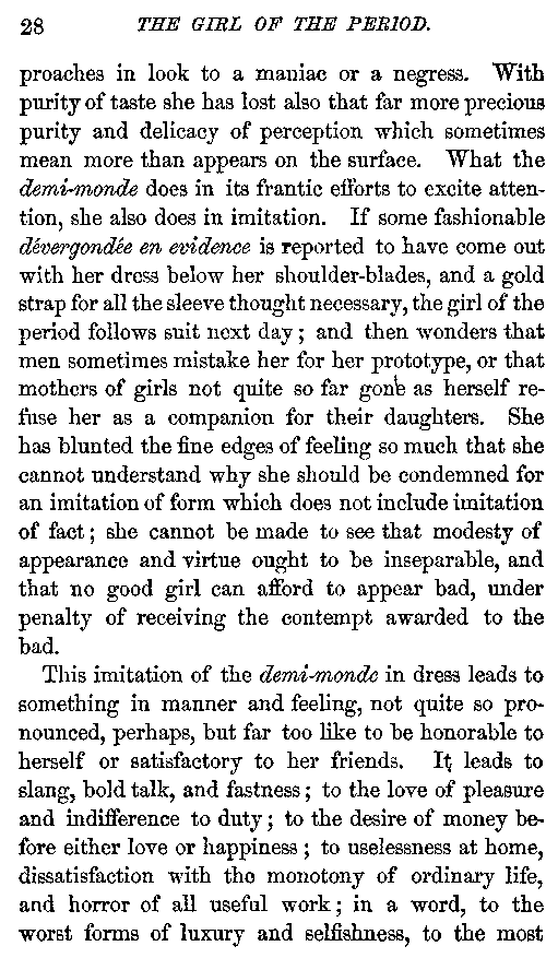 If there is a reaction against an excess of Rowland's Macassar, and hair shiny and sticky with grease is thought less nice than if left clean and healthy crisp, she dries and frizzes and sticks hers out on end like certain savages in Africa, or lets it wander down her back like Madge Wildfire's, and thinks herself all the more beautiful the nearer she [28]approaches in look to a maniac or a negress. With purity of taste she has lost also that far more precious purity and delicacy of perception which sometimes mean more than appears on the surface. What the demi-monde does in its frantic efforts to excite attention, she also does in imitation. If some fashionable dévergondée en evidence is reported to have come out with her dress below her shoulder-blades, and a gold strap for all the sleeve thought necessary, the girl of the period follows suit next day; and then wonders that men sometimes mistake her for her prototype, or that mothers of girls not quite so far gone as herself refuse her as a companion for their daughters. She has blunted the fine edges of feeling so much that she cannot understand why she should be condemned for an imitation of form which does not include imitation of fact; she cannot be made to see that modesty of appearance and virtue ought to be inseparable, and that no good girl can afford to appear bad, under penalty of receiving the contempt awarded to the bad.