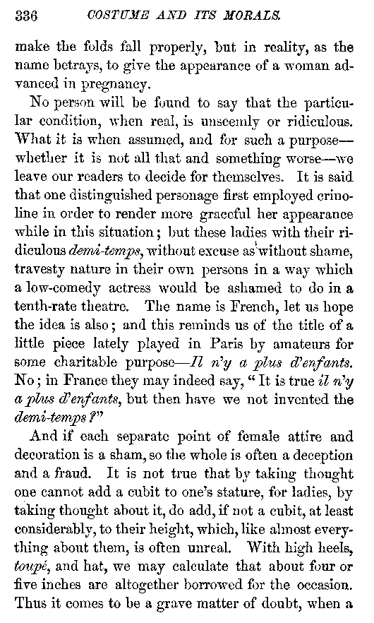The women who are not as those who love their lords wish to be—indeed, as we have heard, those who have no lords of their own to love—have conceived the notion that, by simulating an "interesting condition" (we select the phrase accepted as the most delicate), they will add to their attractions; and for this purpose an article of toilet—an india-rubber anterior bustle—called the demi-temps, has been invented, and is worn beneath the dress, nominally to [336]make the folds fall properly, but in reality, as the name betrays, to give the appearance of a woman advanced in pregnancy.