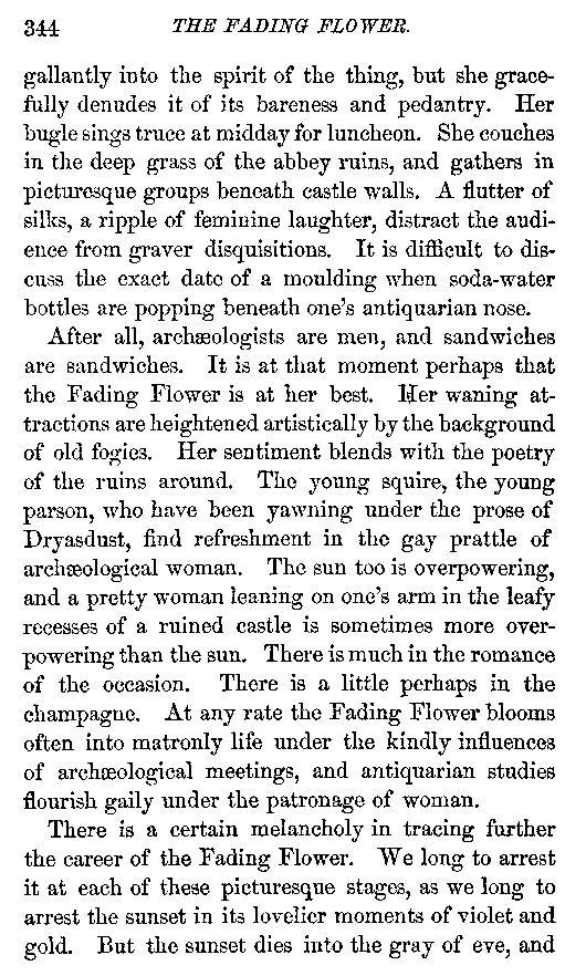 After all, archæologists are men, and sandwiches are sandwiches. It is at that moment perhaps that the Fading Flower is at her best. Her waning attractions are heightened artistically by the background of old fogies. Her sentiment blends with the poetry of the ruins around. The young squire, the young parson, who have been yawning under the prose of Dryasdust, find refreshment in the gay prattle of archæological woman. The sun too is overpowering, and a pretty woman leaning on one's arm in the leafy recesses of a ruined castle is sometimes more overpowering than the sun. There is much in the romance of the occasion. There is a little perhaps in the champagne. At any rate the Fading Flower blooms often into matronly life under the kindly influences of archæological meetings, and antiquarian studies flourish gaily under the patronage of woman.