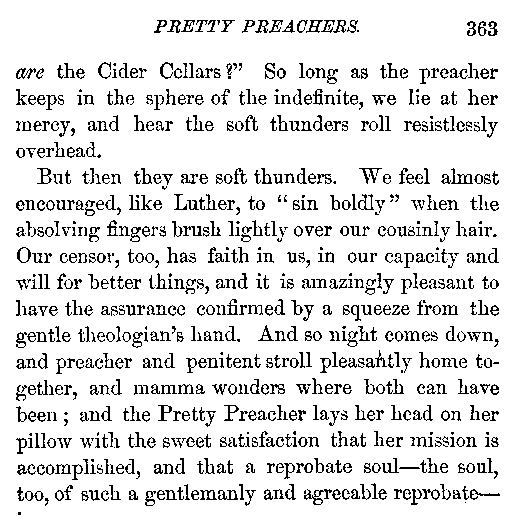The evening deepens, and the sermon deepens with it. It is one of the most disgusting points about the divine in the pulpit that he is always boasting of himself as a man like as we are, and of the sins he denounces as sins of his own. It is the special charm of the fair divine above us that she is eminently a being not as we are, but one serene, angelic, pure. It is the very vagueness of her condemnation that tells on us—the utter ignorance of what is so familiar to us that the vagueness betrays, the utter unskillfulness of the hits, and the purity that makes them so unskillful. It is only when she descends to particulars that we can turn round on the Pretty Preacher—only when a burning and impassioned invective against Cider Cellars suddenly softens into the plaintive inquiry, "But, oh, Charlie, dear, what [363]are the Cider Cellars?" So long as the preacher keeps in the sphere of the indefinite, we lie at her mercy, and hear the soft thunders roll resistlessly overhead.