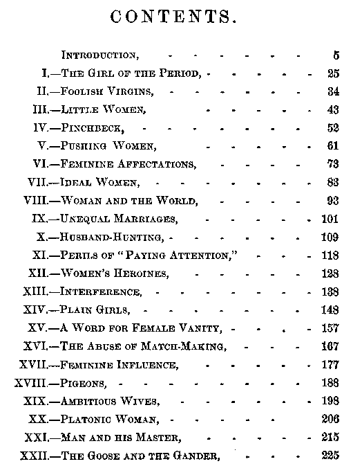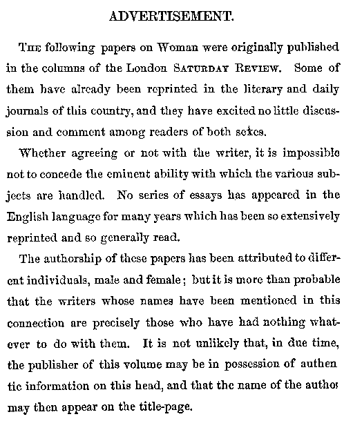 The following papers on Woman were originally published in the columns of the London Saturday Review. Some of them have already been reprinted in the literary and daily journals of this country, and they have excited no little discussion and comment among readers of both sexes.
