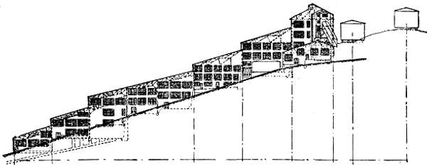 Sowohl in Amerika als auch in Afrika und Australien sind nun riesige Zyanidanlagen in fortwährender Tätigkeit, um das Gold aus zermahlenem Golderz oder schwach goldhaltigem Sande auszuziehen, und der größte Teil der Weltproduktion, die im Jahre 1911 an 1900 Millionen Mark betrug, wird auf diese Weise gewonnen. Im hügeligen und bergigen Gelände des amerikanischen Westens sieht [10] man häufig die eigenartig gebauten, an den Bergabhang gelehnten Zyanidwerke, denen oben das Erz in Waggonladungen zugeführt wird. Auf dem Wege nach unten wird dem Erz das Gold durch Zyankalium entzogen und am unteren Ende der „Goldmühle“ das gediegene Gold in Barren gegossen. Unermüdlich mahlen die Mühlen, unermüdlich übt das Zyankalium seine lösende Wirkung aus; ohne Ruhe und ohne Rast, Tag und Nacht, in stetiger, einförmiger Gleichmäßigkeit wird hier gewonnen, was dann draußen die Menge in rasende Aufregung versetzt, wird das Ziel der Habgier gewonnen, wird das gewonnen, was viele für den eigentlichen Lebenszweck halten, das, was sie für wertvoller achten als das Leben selbst (Abb. 8).